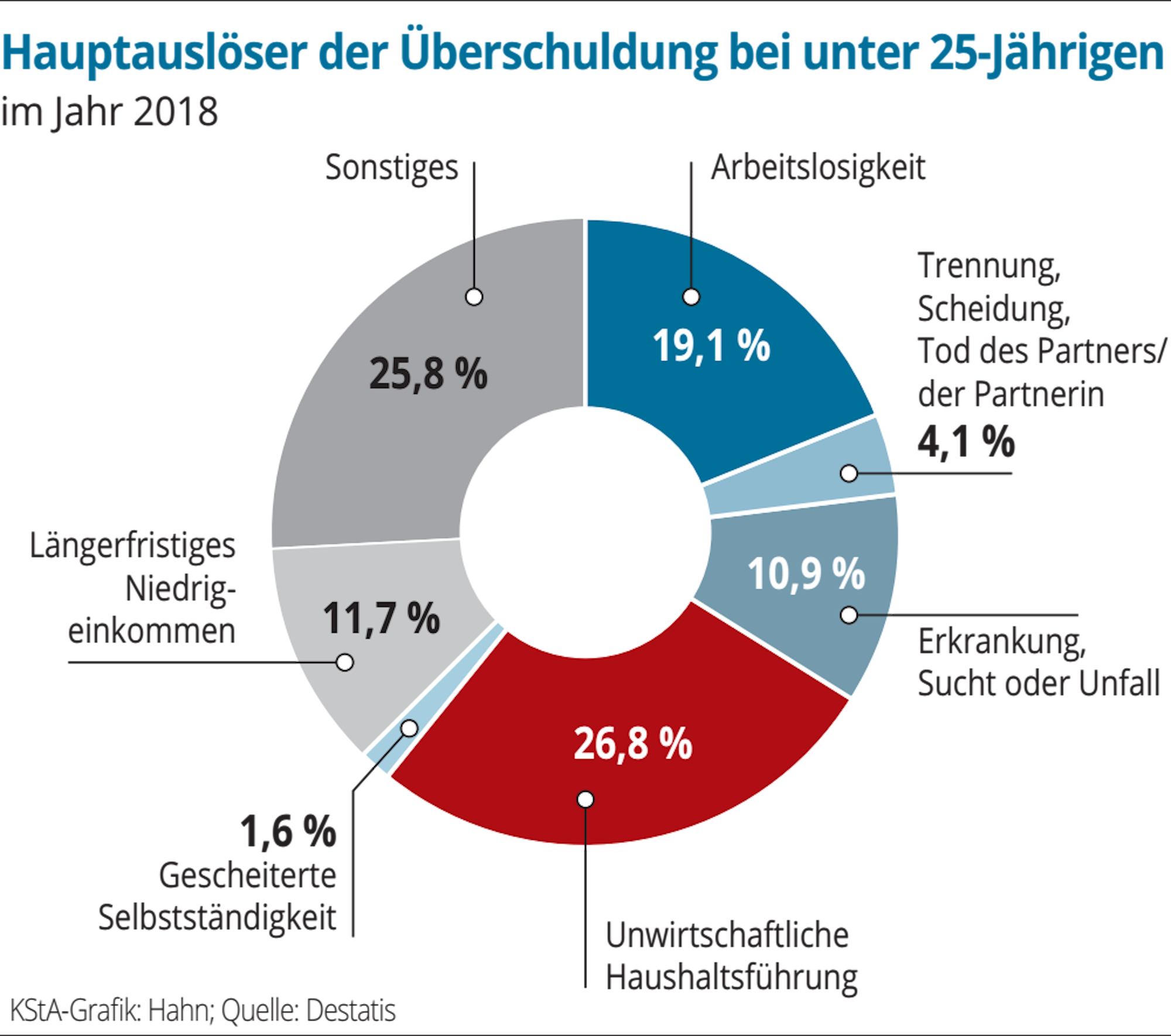 Natürlich sei auch der unwirtschaftliche Umgang mit Geld ein Faktor, aber wer entlassen wird, sich trennt oder erkrankt, hat auch als junger Mensch ein höheres Risiko, Schulden anzuhäufen. Laut dem Schuldneratlas 2020, einer Untersuchung von Creditreform, sind 1,1 Millionen Menschen unter 30 Jahren in Deutschland verschuldet. Sie machen etwas weniger als ein Fünftel der 6,8 Millionen überschuldeten Personen aus.