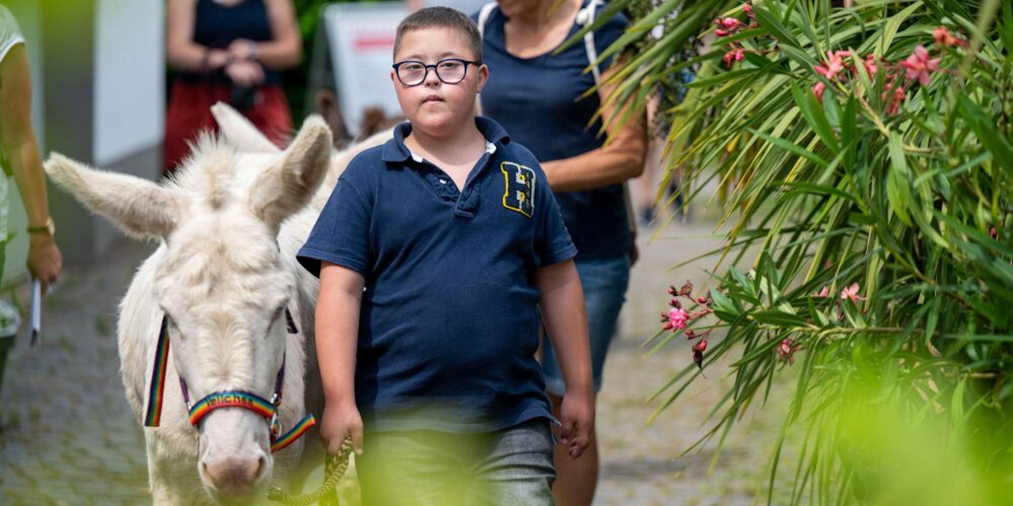 Holger Peters setzt seine Esel pädagogisch bei Kindern mit Förderbedarf ein. Alex kommt seit über fünf Jahren zu ihm, mittlerweile läuft er die wenigen Straßen von Zuhause alleine. „Alex lernt mit den Eseln, seine Kräfte besser zu dosieren. Er ist viel vorsichtiger geworden“, sagt sein Vater, der an diesem Samstagnachmittag ebenfalls mitspaziert. Bei so vielen Menschen ist Alex’ aufgeregt, er rennt hin und her, seine Freundin Marie ist heute auch dabei. Plötzlich hat der Junge keine Lust mehr mit Veilchen am Strick die Gruppe anzuführen. Auch das lernt er bei Holger Peters: Bei der Sache bleiben.