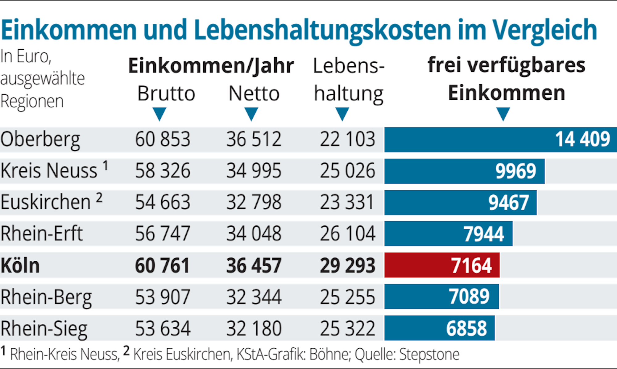 Auch der Rhein-Kreis Neuss könnte für viele Kölner eine finanzielle Verbesserung bedeuten. Zwar verdienen Arbeitnehmer dort mit durchschnittlich 58 326 Euro im Jahr brutto etwas weniger als in Köln. Nach Abzug aller Lebenshaltungskosten blieben ihnen jedoch jährlich rund 2800 Euro und damit 39 Prozent mehr Geld. Im Landkreis Euskirchen wären es immerhin noch 2300 Euro – hier wiegen die besonders günstigen Lebenshaltungskosten die durchschnittliche Gehaltslücke von etwa 6100 Euro im Jahr auf.