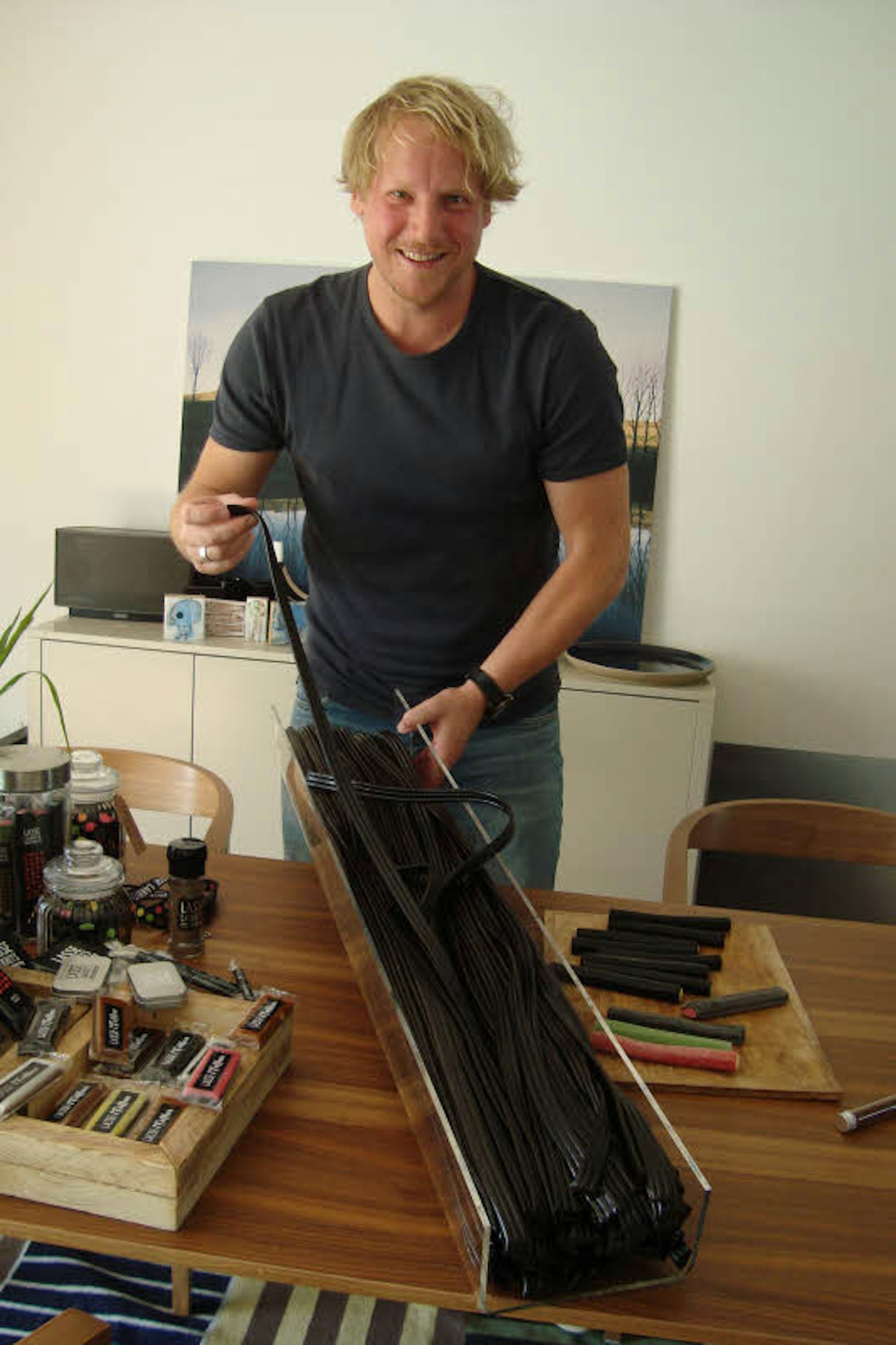 „Die Süßigkeiten im Norden sind ganz anders, dort ist man viel kreativer in Bezug auf die Geschmacksrichtungen“, schwärmt der Jungunternehmer, der den sicheren Job kündigte, um fortan auf Märkten in einem Zelt Lakritz zu verkaufen. Mit stetig wachsendem Erfolg, denn die schwarzen Stangen mit einer Füllung aus Himbeere, Limone, Orange, Apfel oder Spearmint sind nicht nur optisch ein Knüller. Sie bieten auch ein Geschmackserlebnis der besonderen Art. Hauptbestandteil ist die Süßholzwurzel, die gekocht und eingedickt und mit Weizenmehl und Sirup versetzt wird. Ein englischer Apotheker war es, der die bis dato nur als Heilmittel bekannte Süßholzwurzel zur Süßigkeit machte.