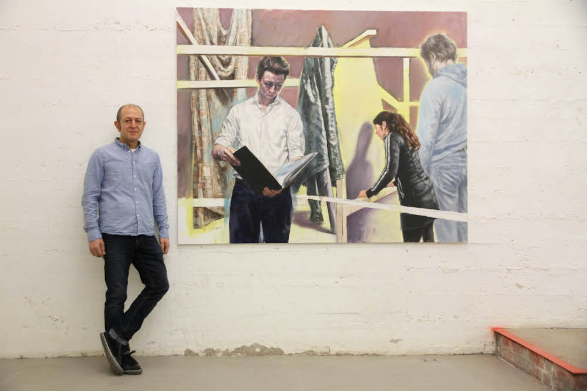 Ein große Arbeit, die Sadedin auf der untersten Ebene des Pumpwerks zeigt, lässt ahnen, dass die Zukunft weg von der Darstellung einzelner Personen hin zu Gruppen führen könnte. Drei Figuren aus anderen Bildern hat er auf diesem Ölbild zusammengebracht, den jungen Mann, der mit gespanntem Gesichtsausdruck in ein geöffnetes Buch blickt, eine Frau, die die Stirn gegen eine Wand lehnt, und einen blau gekleideten Mann vor einer Konstruktion aus Holz, Plane und einem Rohr – eine Auseinandersetzung Sadedins mit den katastrophalen Zuständen im Flüchtlingslager von Calais.