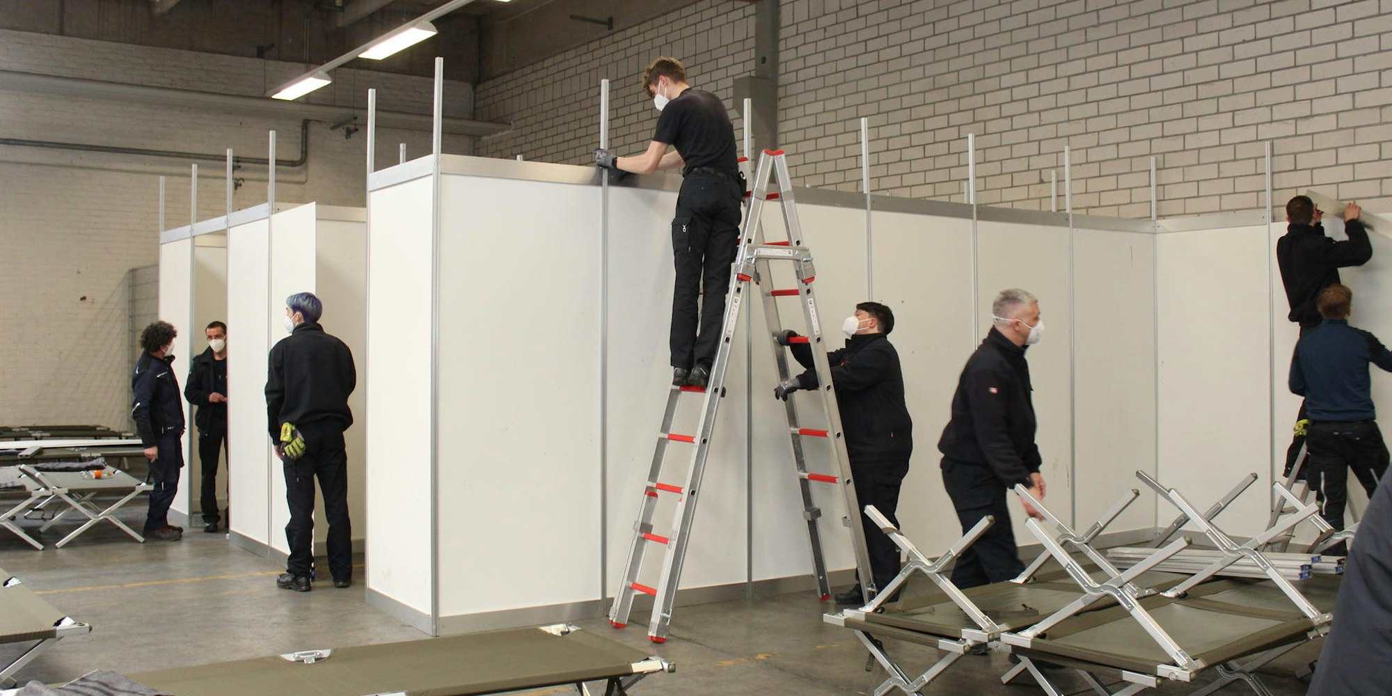 Derzeit trennen Einsatzkräfte der Feuerwehr einzelne Wohnbereiche ab und richten sie ein.