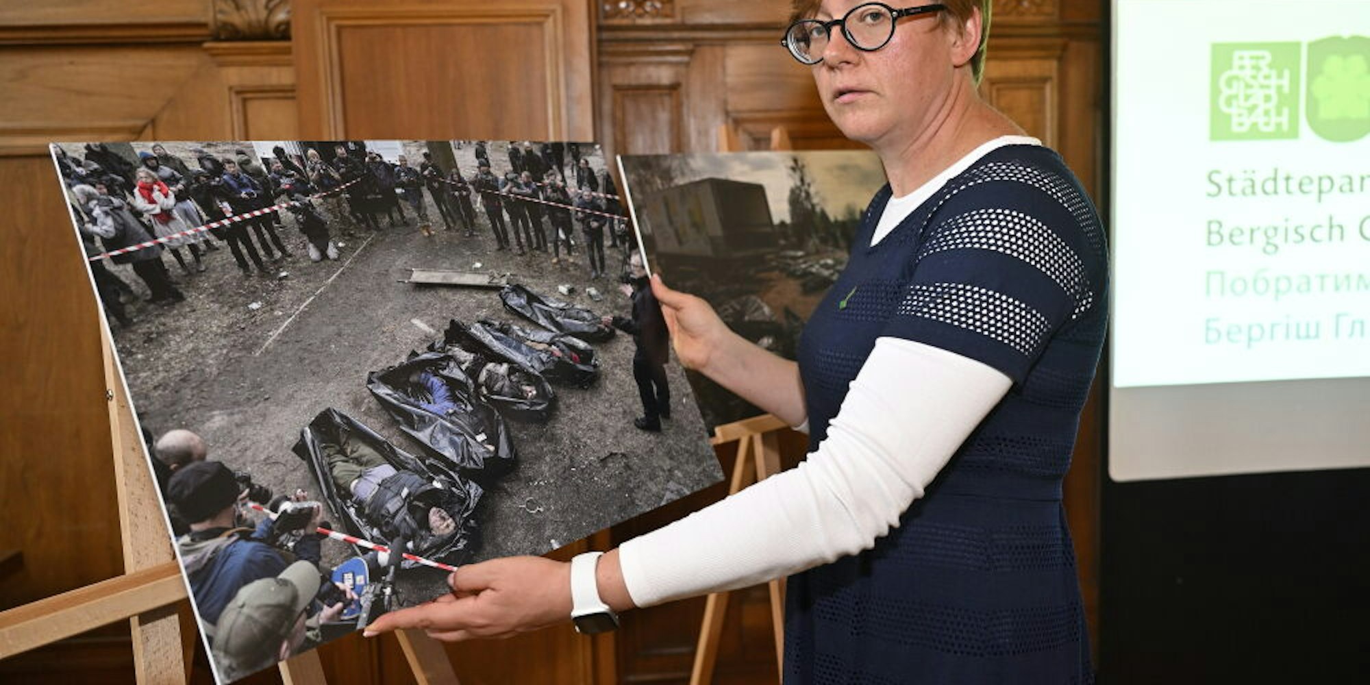 Bergisch Gladbach/Butscha – Fünf Männer liegen in offenen Leichensäcken. Journalisten stehen darum, einige wenden ihre Gesichter ab. Das Bild, das Mykhailyna Skoryk-Shkarivska in den Händen hält, ist eine der ersten Aufnahmen der russischen Gräueltaten an ukrainischen Zivilisten, die Anfang April aus Butscha um die Welt gingen.