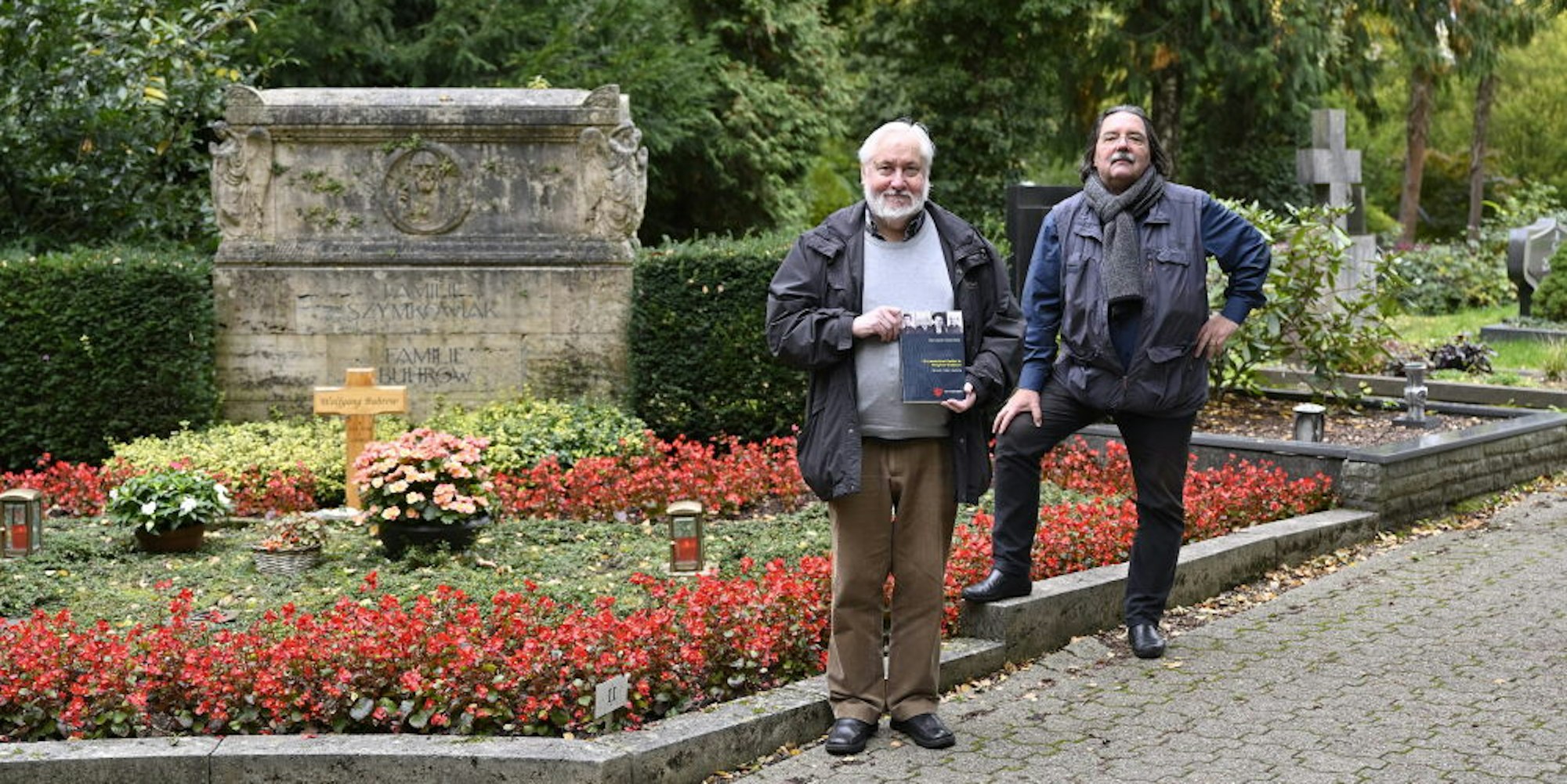 Die Autoren Peter Lückerath (links) und Michael Werling am Grab der Familie Odenthal, die Kaufleute und Politiker hervorbrachte.