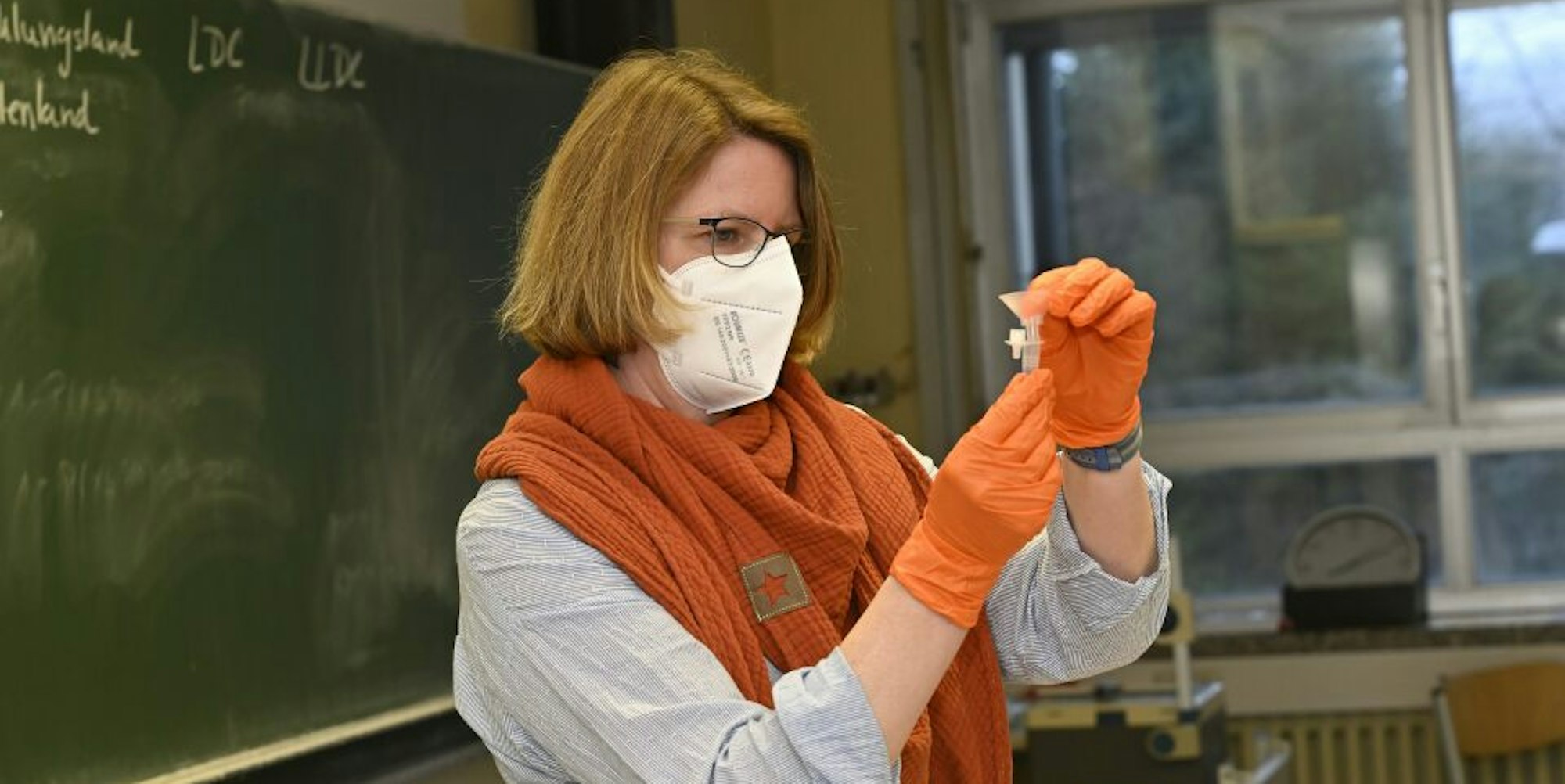Lehrerin Stephanie Holdenried erklärt Schülern der 9 c am NCG, wie der Corona-Spucktest funktioniert.