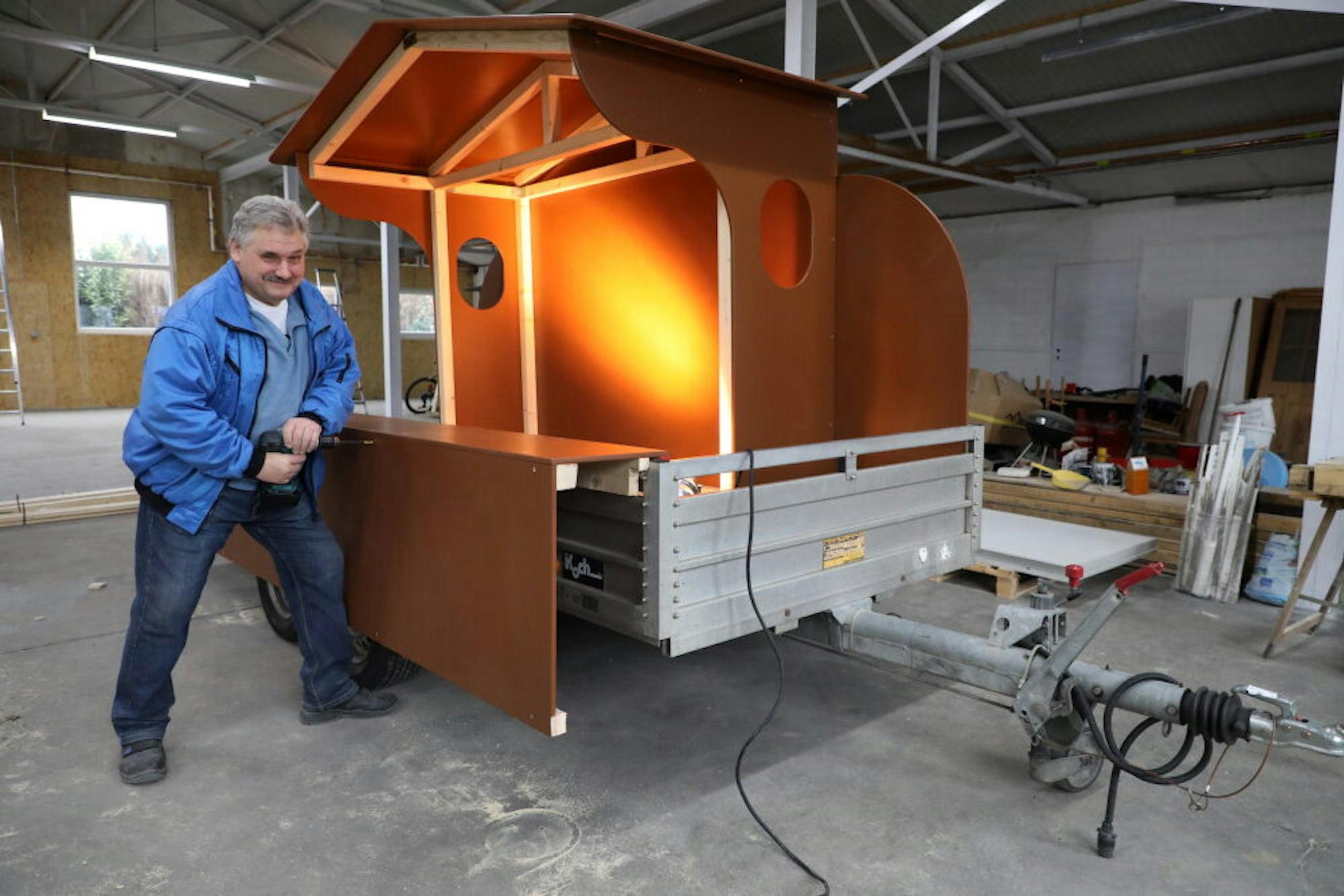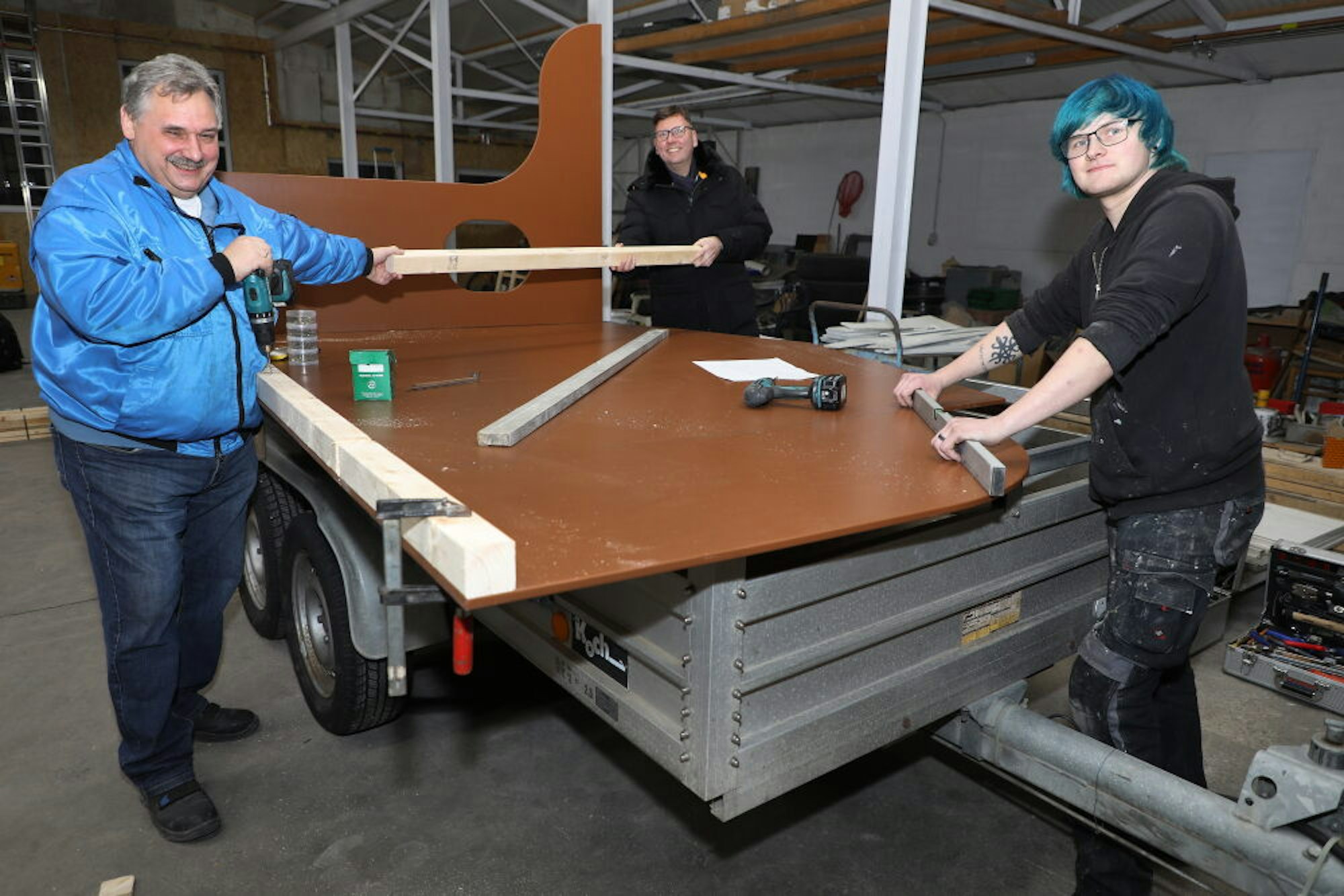 Gemeinsam mit dem angehenden Schreiner Timo Wenzel montierte er in einer von Georg Asselborn zur Verfügung gestellten Gewerbehalle die von Tischler Michael Sladek ausgesägten Stallwände auf einen Anhänger.
