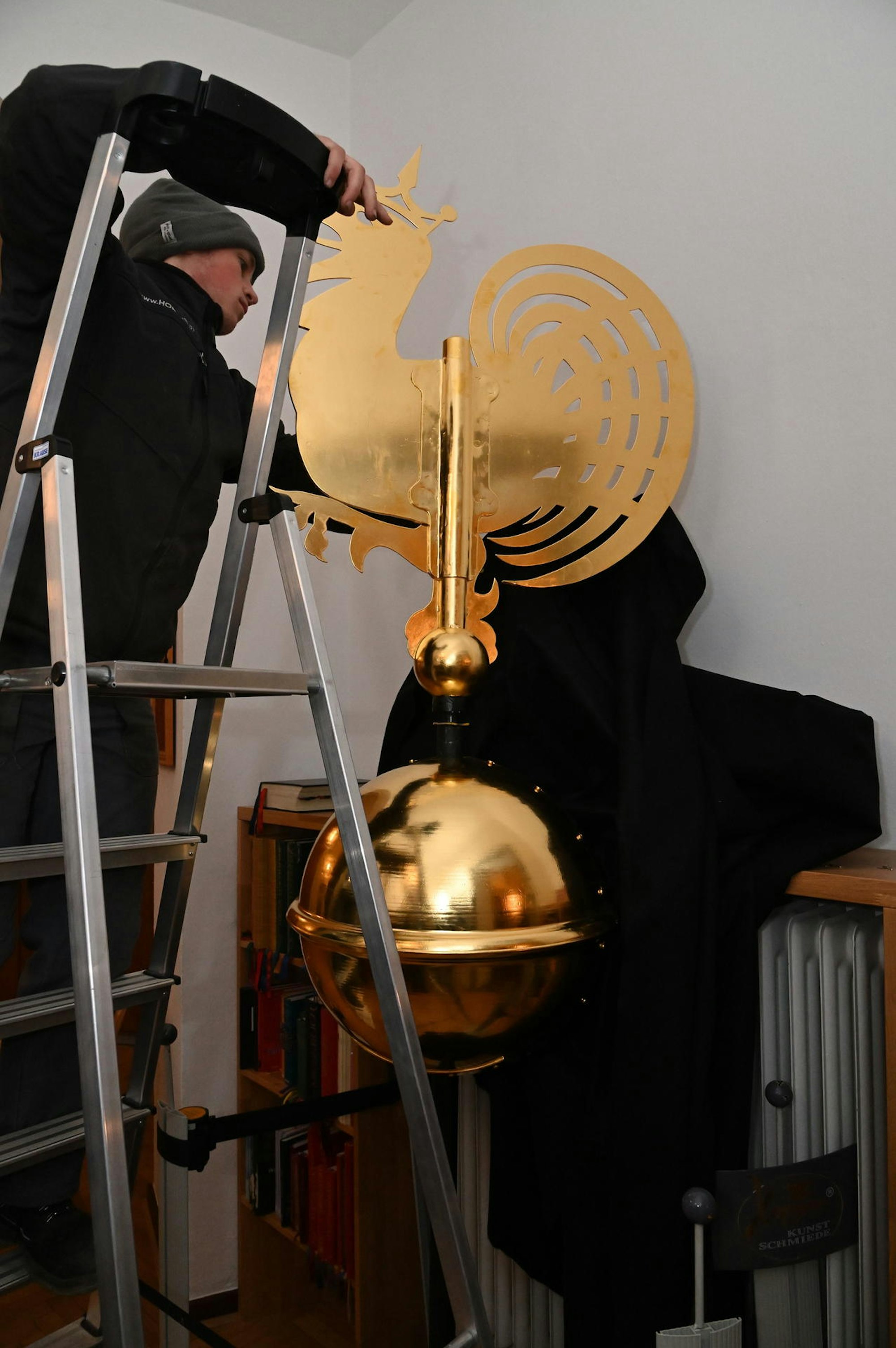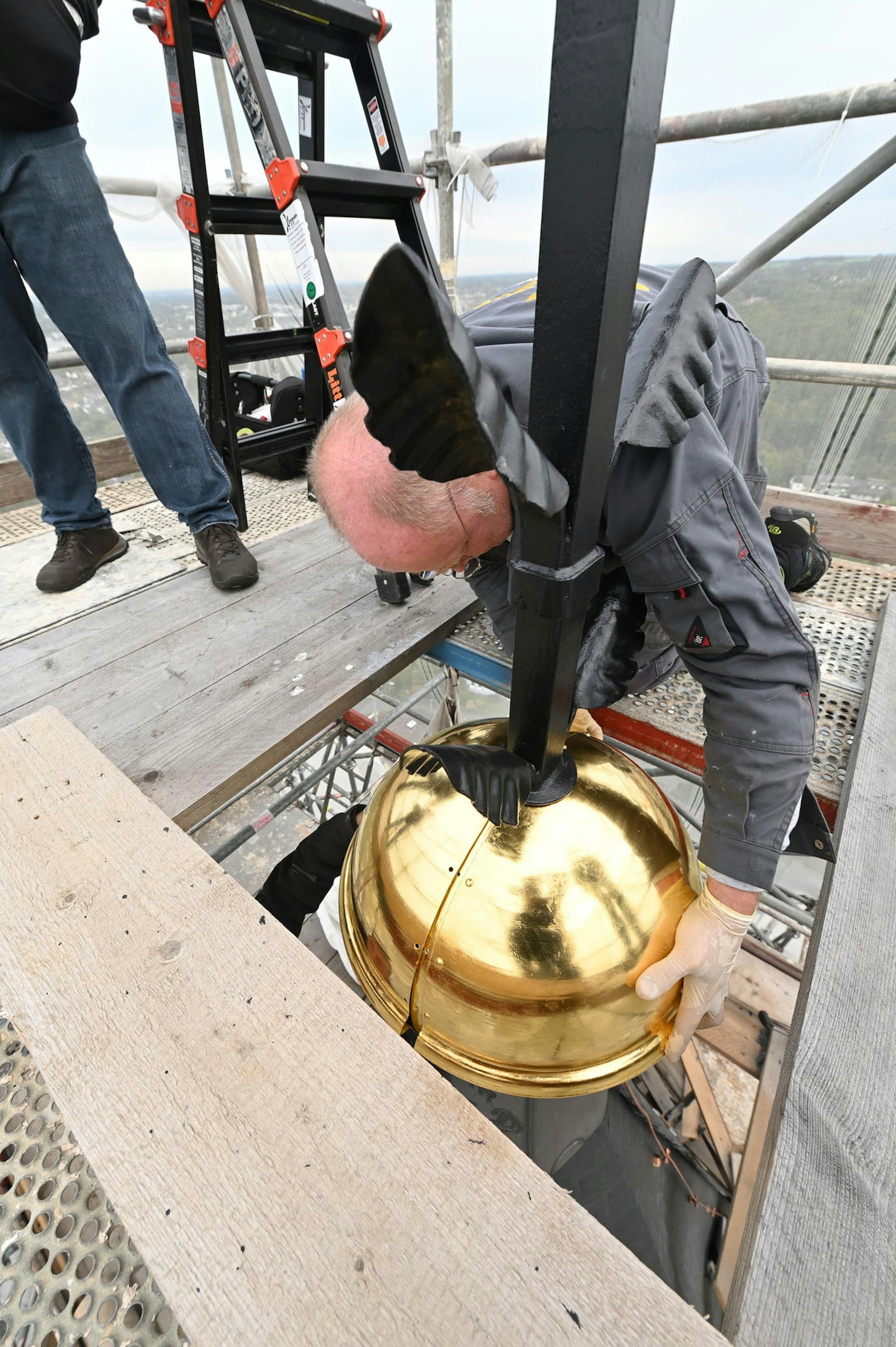 Wolfgang Mehren von der Kunstschmiede Hoppen montiert die ebenfalls vergoldete Kugel, die unter dem Wetterhahn sitzt.