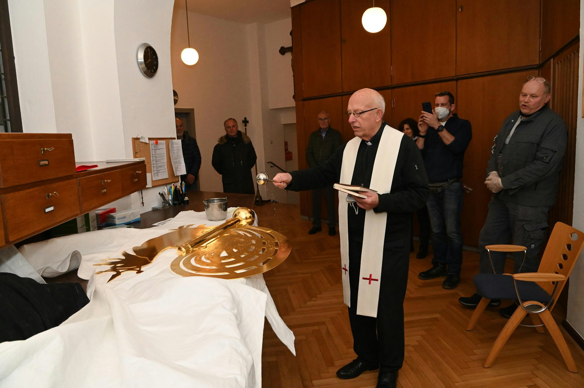 Pfarrer Johannes Börsch segnete den vergoldeten Wetterhahn vor der Montage feierlich ein.