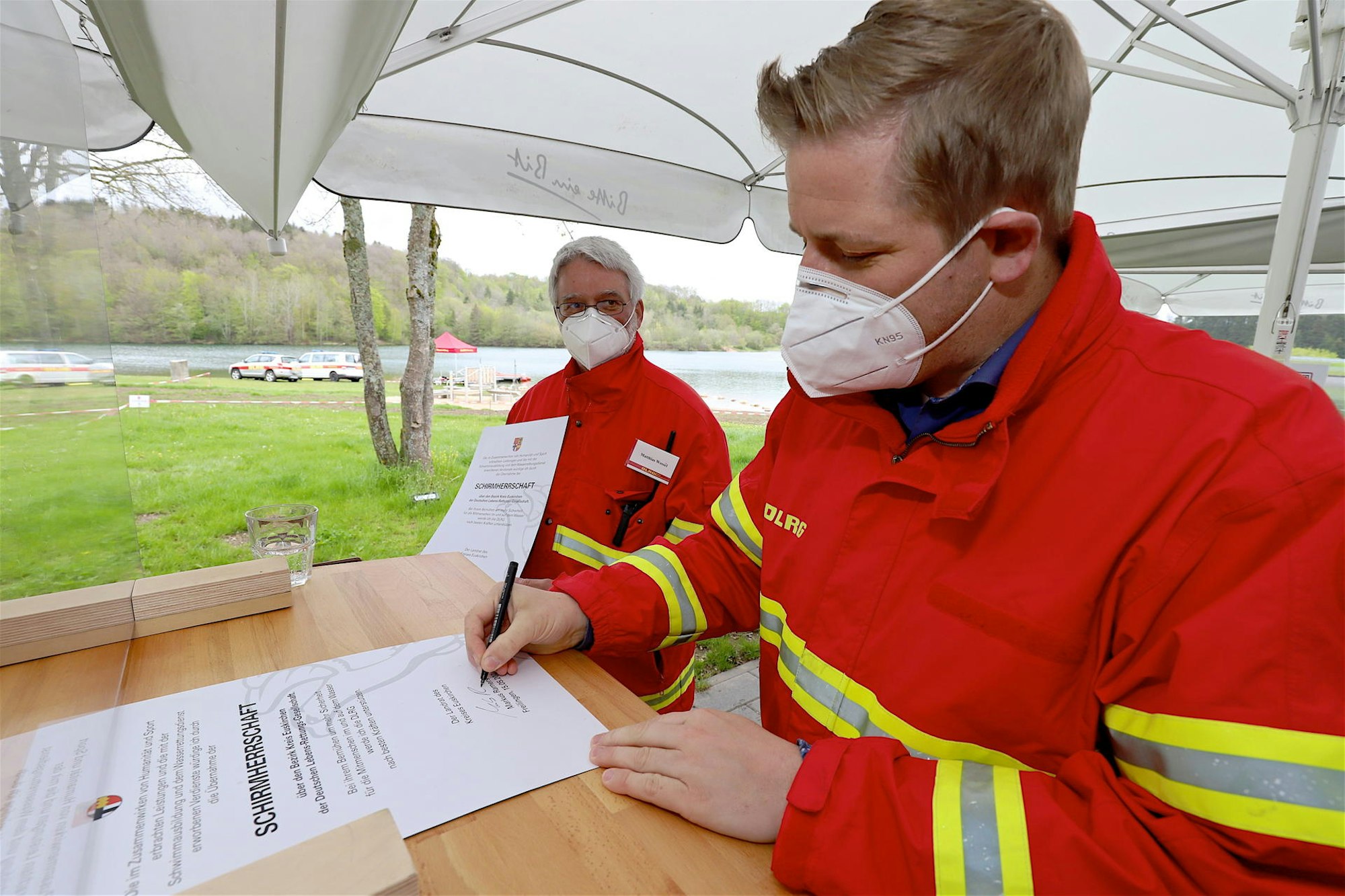 Blankenheim-Freilingen – Die rote Jacke der Deutschen Lebens-Rettungs-Gesellschaft (DLRG), die Landrat Markus Ramers als Regenschutz anziehen durfte, versprach Sicherheit, doch die extra angefertigte Aufschrift „Schirmherr“ zeigte die Realität. „Den darf man nicht fragen, wenn man untergeht“, scherzte Ramers. Am Samstag übernahm er anlässlich der Eröffnung der Badesaison am Freilinger See die Schirmherrschaft über die DLRG im Kreis Euskirchen.