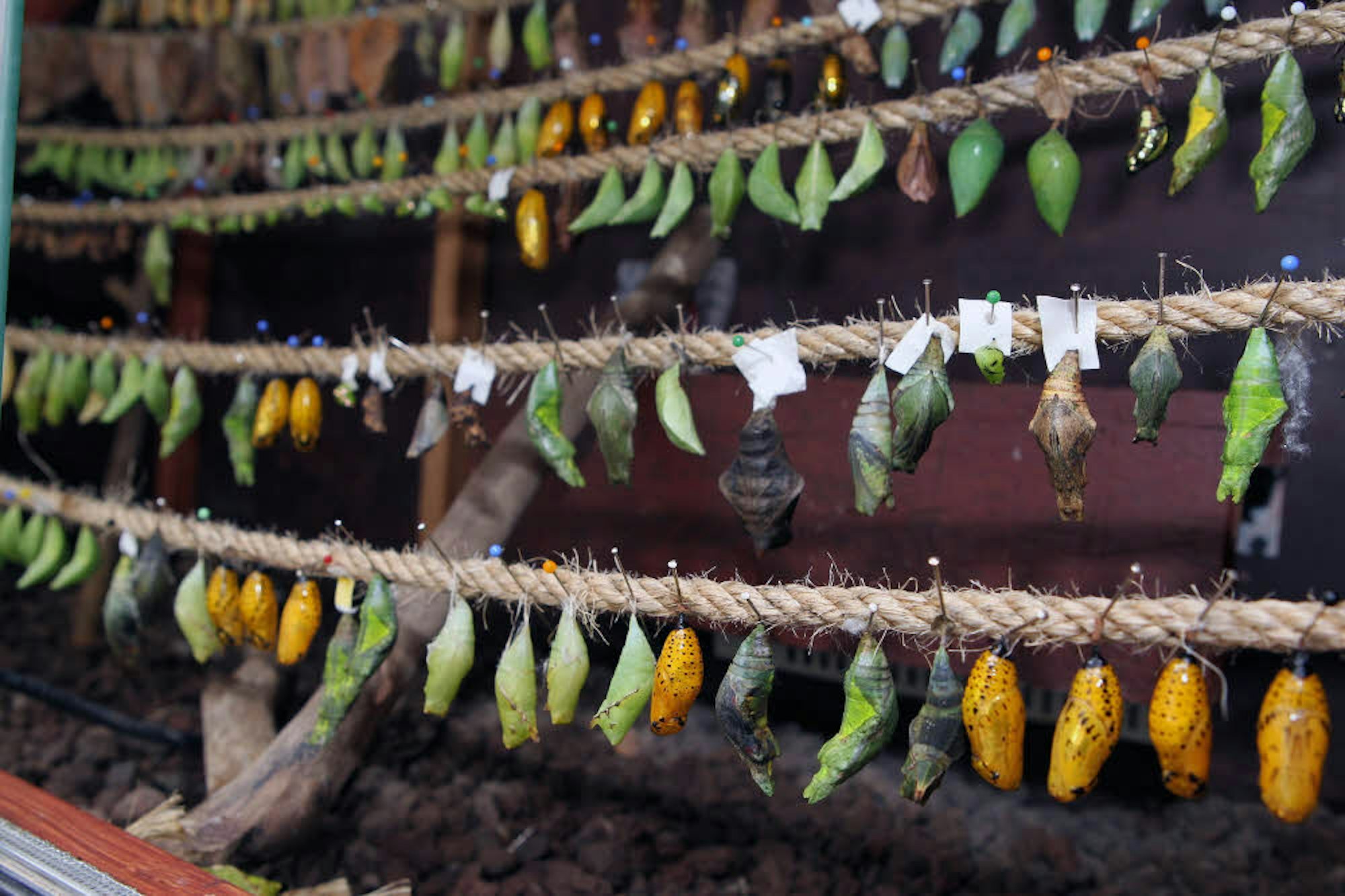Vorbei geht es an einem Glaskasten. „Das ist unser Puppenkasten“, sagt Große-Meininghaus. Im Brutkasten hängen an Seilen die Puppen von mehr als 200 Schmetterlingsarten. „Das ist eine frische Lieferung. Die Schmetterlinge kommen aus der ganzen Welt und werden über einen Spezial-Postversand zu uns auf die Reise geschickt“, so Große-Meininghaus. Die Puppen stammen etwa aus Brasilien oder Costa Rica. Über einen Umschlagsplatz in England gelangen sie, durch Styropor geschützt, in die Eifel.
