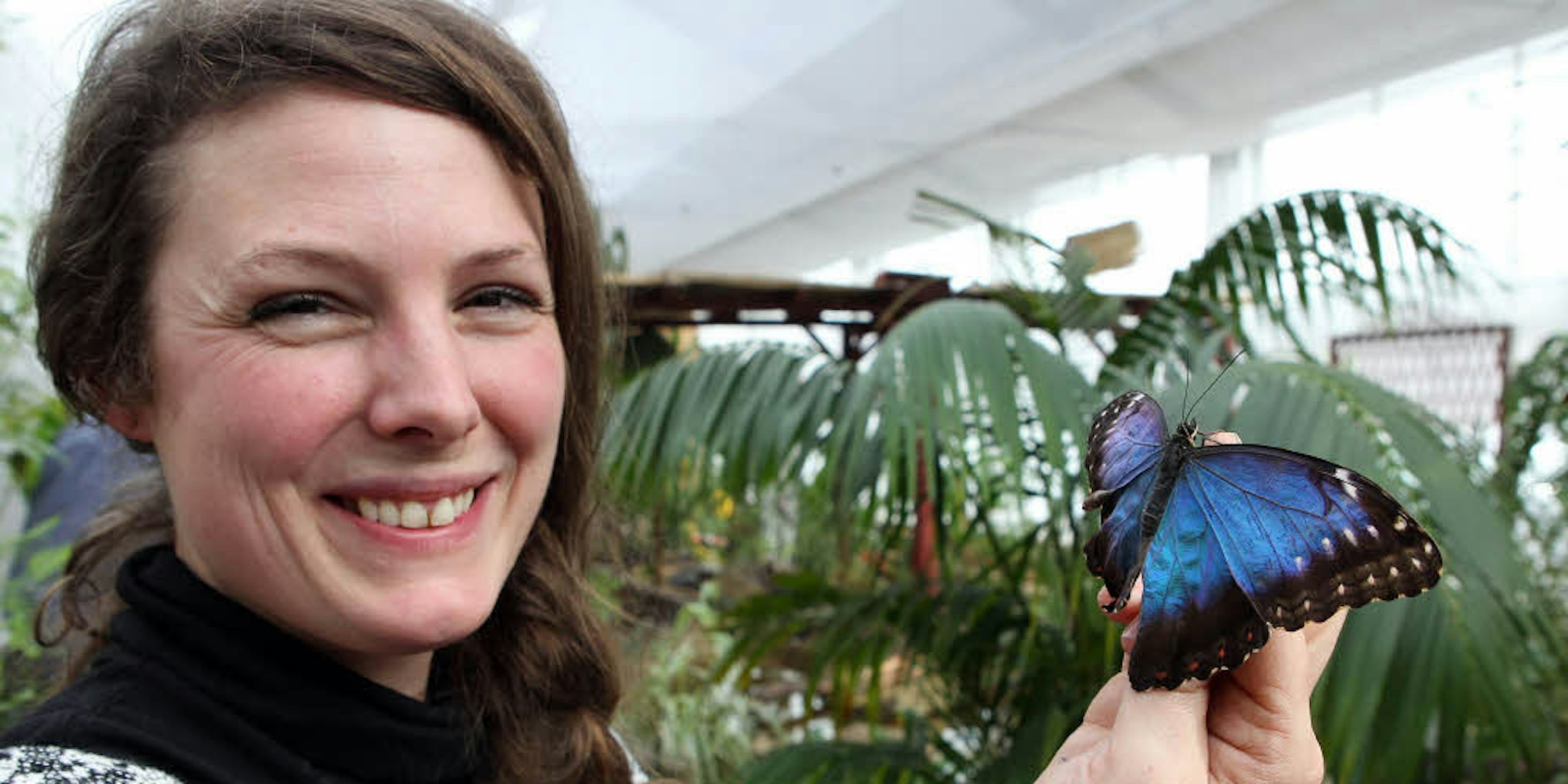 Bunte Prachtexemplare, etwa diesen blauen Morphofalter, präsentiert Ulla Große-Meininghaus im Schmetterlingsgarten.