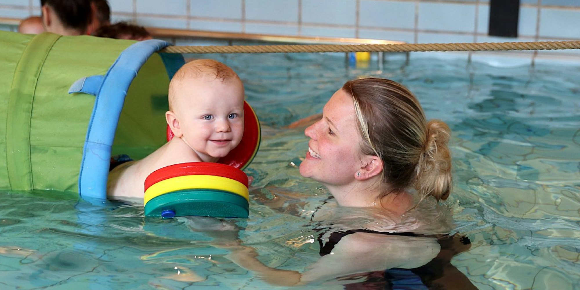 Im Babyschwimmkurs, an dem Johanna Langer und mit ihrem Sohn Luuk teilnimmt, werden auch Wasserspielzeug und ein schwimmender Tunnel genutzt.