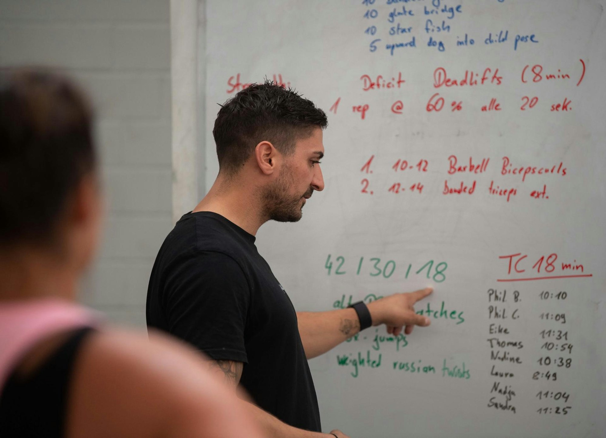 Trainer Luca Morina erklärt an der Tafel die Übungen und wie viele Wiederholungen die Sportler schaffen müssen.