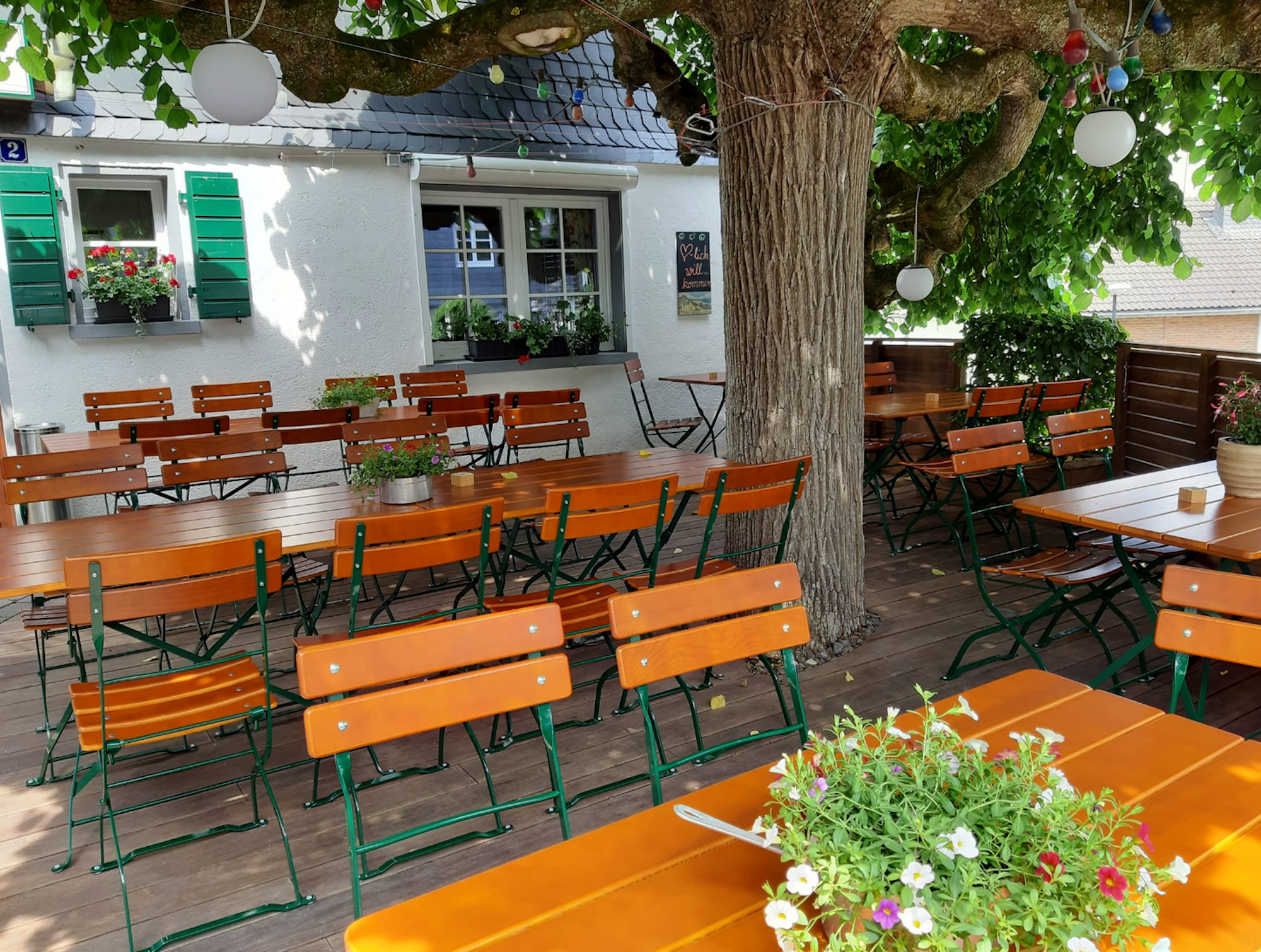Die alte Ulme spendet den Besuchern im Biergarten Schatten.