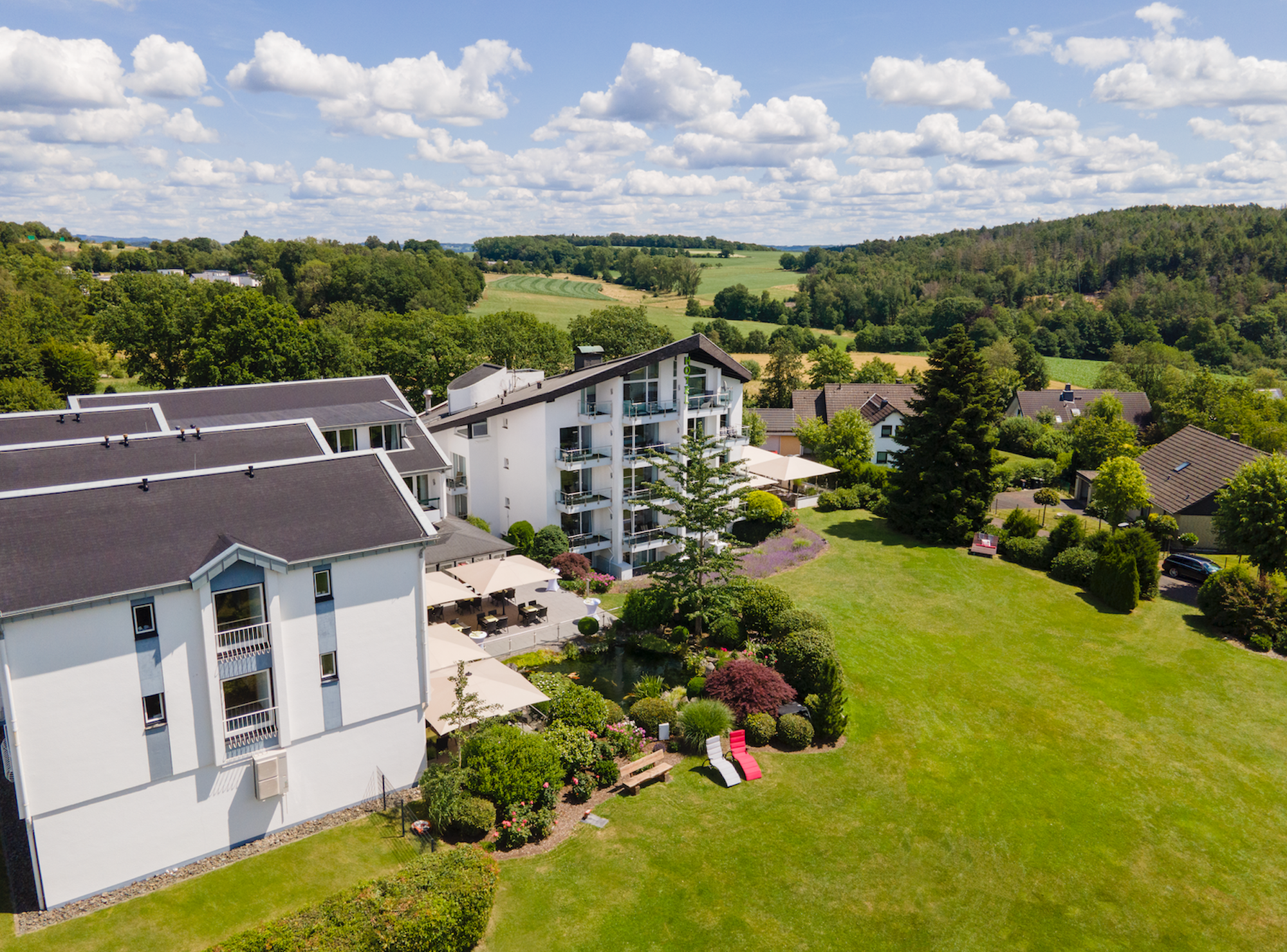 Die Anlage des Derichsweiler Hofs befindet sich im Grünen und besticht durch ihren großzügig angelegten Garten.