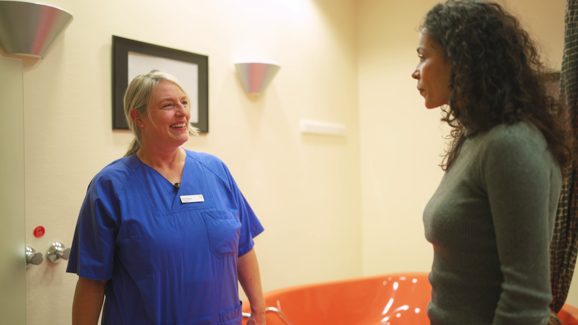 Heidi Schweizer (links), leitende Hebamme in der Frauenklinik, stellt sich den Fragen von Dr. Flojo