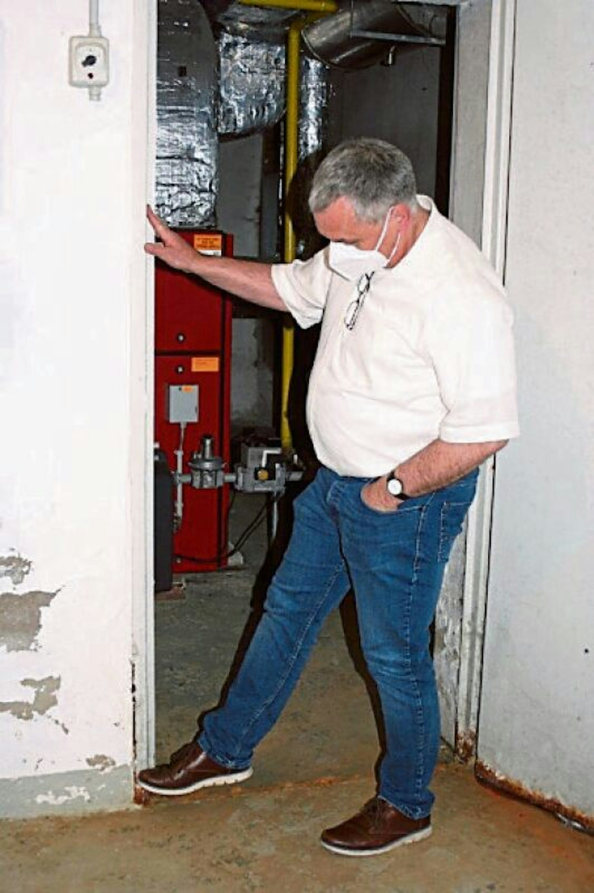 Die Ausschussmitglieder sahen sich nicht nur im Hauptraum des zwölfeckigen Kirchengebäudes um, von dem sie beeindruckt waren. Sie besichtigten auch den Kirchenkeller, in dem nach Regenfällen schon mal Wasser steht. Bürgermeister Viehof hatte deshalb extra Gummistiefel mitgebracht, brauchte diese aber nicht. Denn die Kellerräume waren an diesem Tag trocken. Ein Kirchenmitarbeiter zeigte allerdings, wie hoch das Wasser nach Regenfällen zuletzt gestanden hatte.