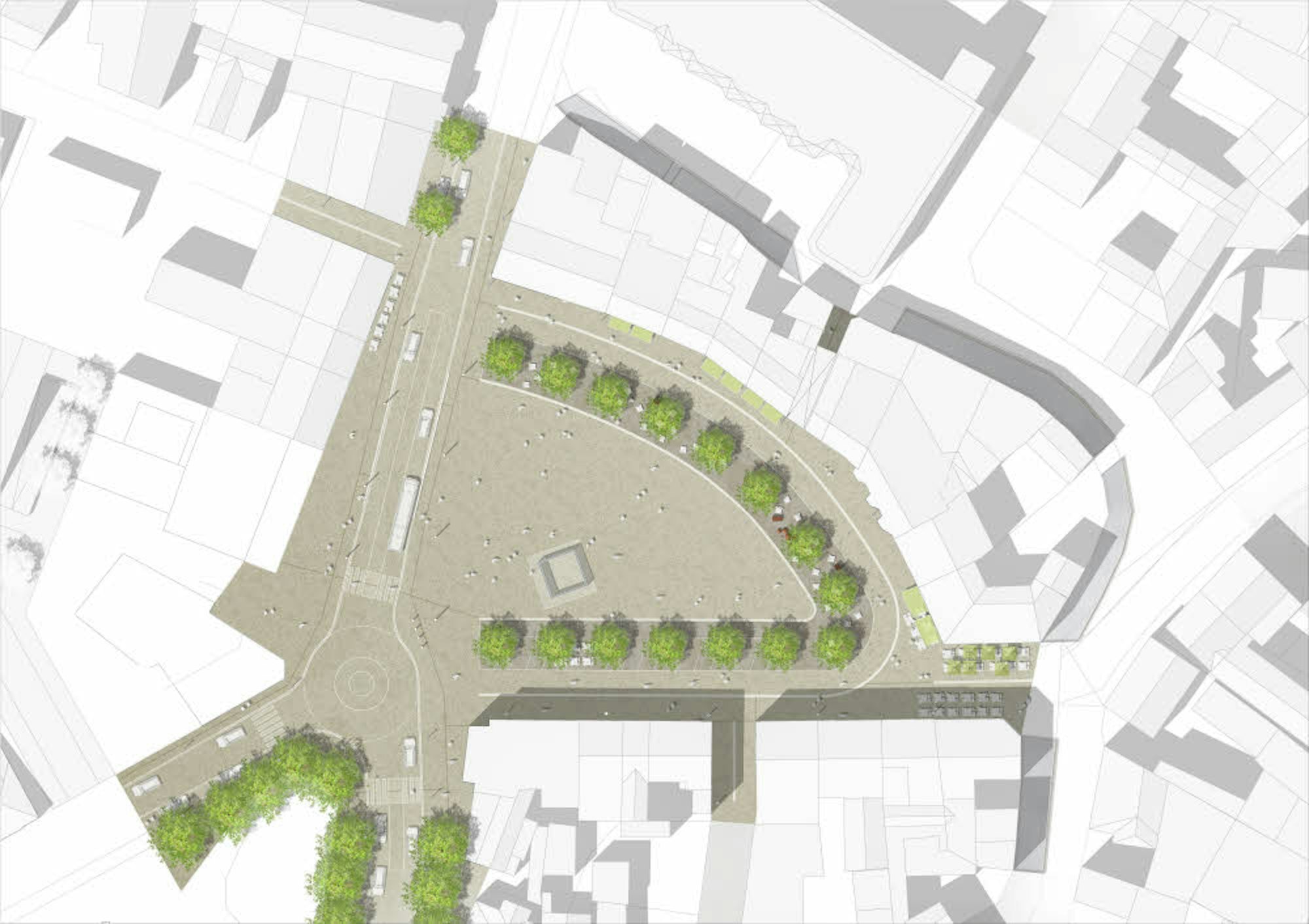 Gleiche Pflasterung auf einer Höhe, ein quadratischer Wasserschleier an Stelle des alten Kirchturms und ein „Aktivitätsband“ aus Bäumen und Sitzgelegenheiten rund um den Markt sind geplant.