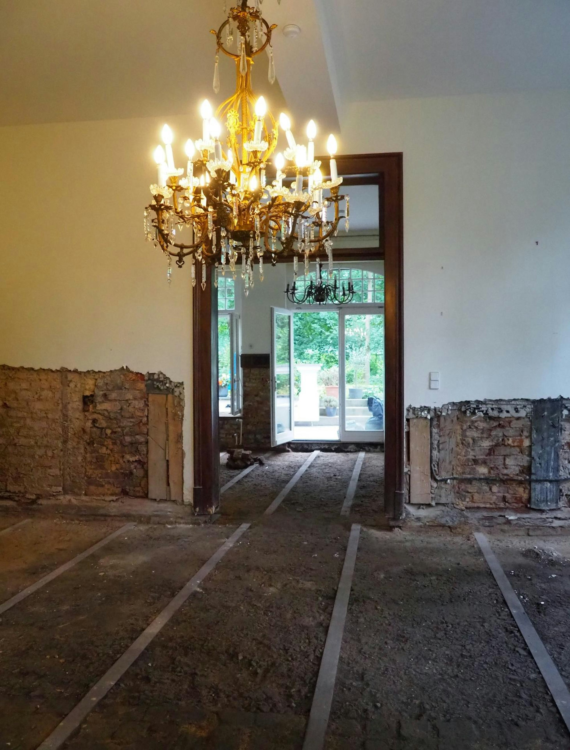 Der prunkvolle Kronleuchter hängt unversehrt in der Wohnung, die vom Hochwasser verwüstet ist.