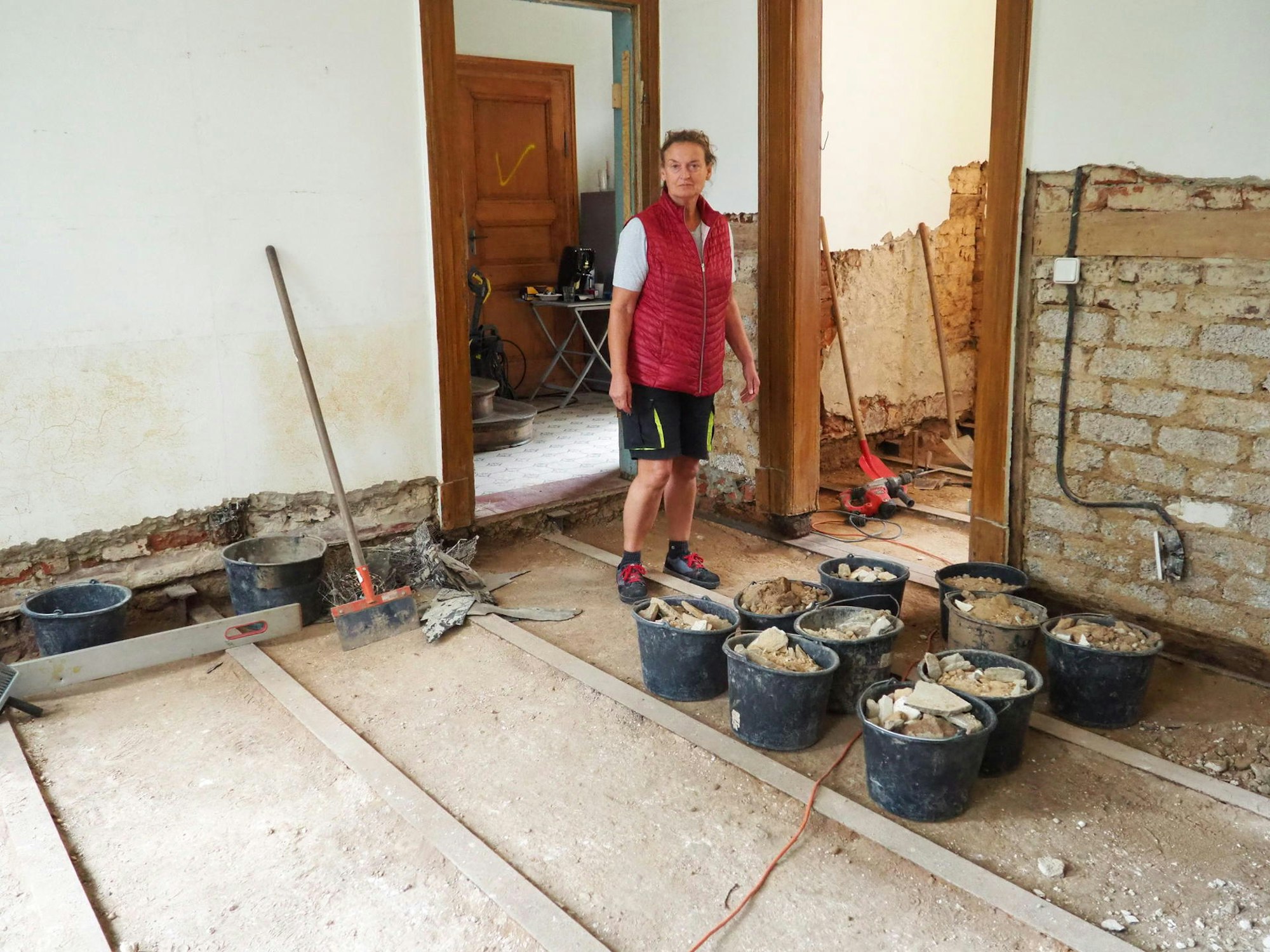 Zwei Monate nach der Überschwemmungskatastrophe wird in der Burg Blessem an allen Ecken und Enden geschuftet. Im Erdgeschoss des Haupthauses ist das alte Eichenparkett herausgerissen worden. Das Holz liegt zum Trocknen in einem Schuppen. Es soll auf jeden Fall wieder verwendet werden, sagt Dagmar Büsges-Osterrieth. Die 81-jährige Besitzerin ist jeden Tag in der Burg. Mit ihren Töchtern Desirée Köhler und Friederike Engels Meyer berät sie, was mit dem Eichenholz passieren soll. Es wieder einzusetzen, wäre teurer, als neues zu verlegen.