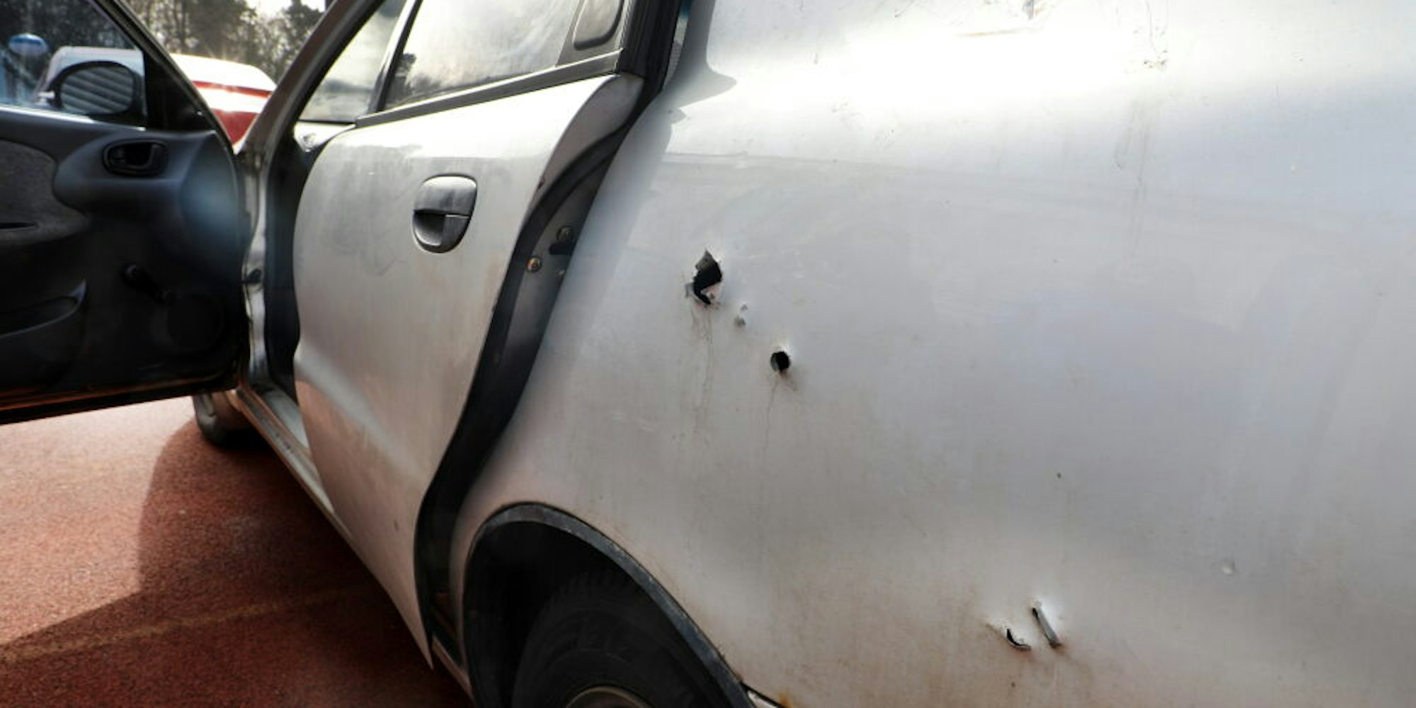 Granatsplitter und Kugeln haben die Karosserie und Scheiben des Autos durchschlagen.