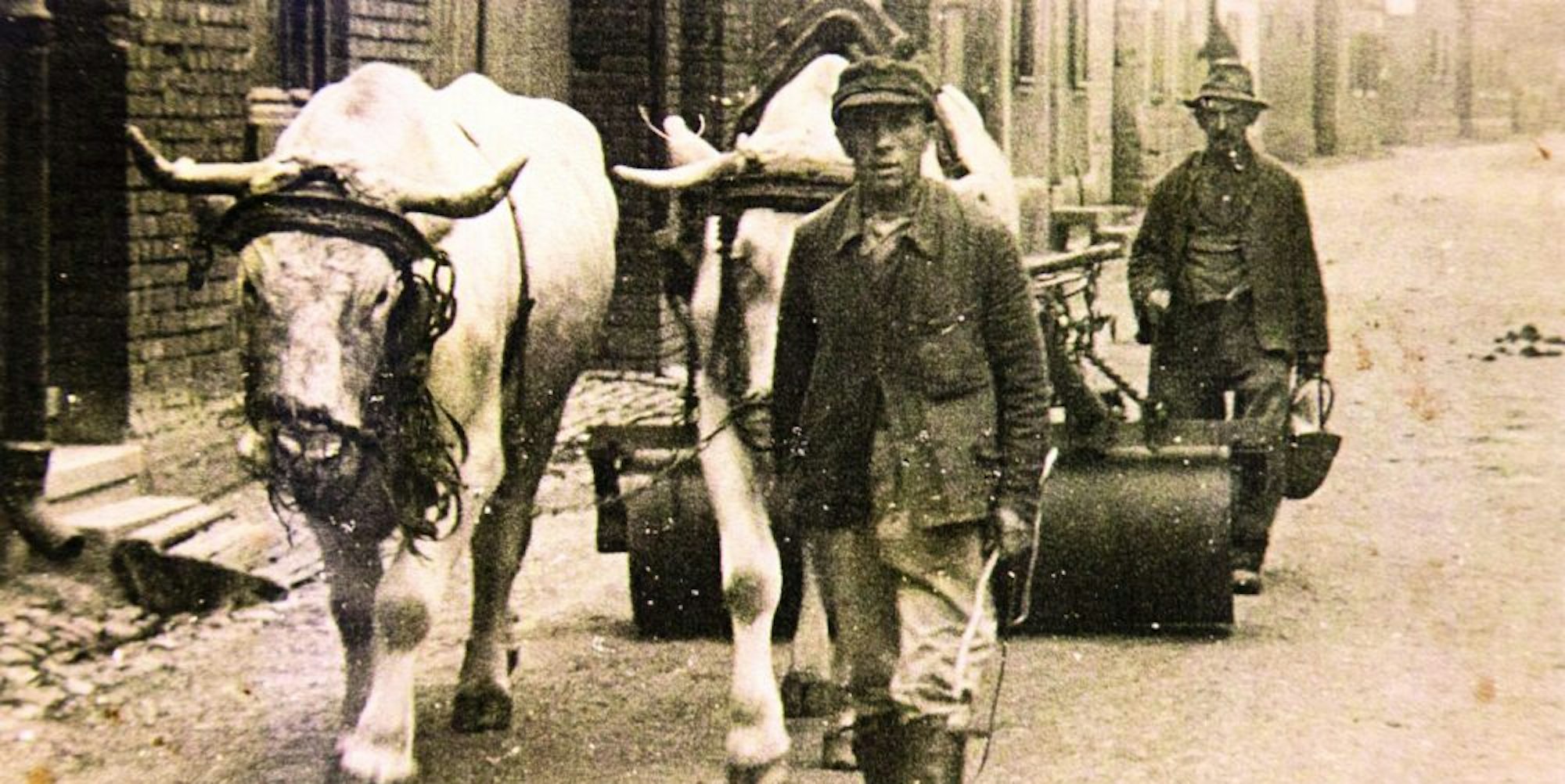 Mit einem Ochsengespann sind Bauer Loosen und ein Landarbeiter (vorne) 1940 in Frauenberg unterwegs.