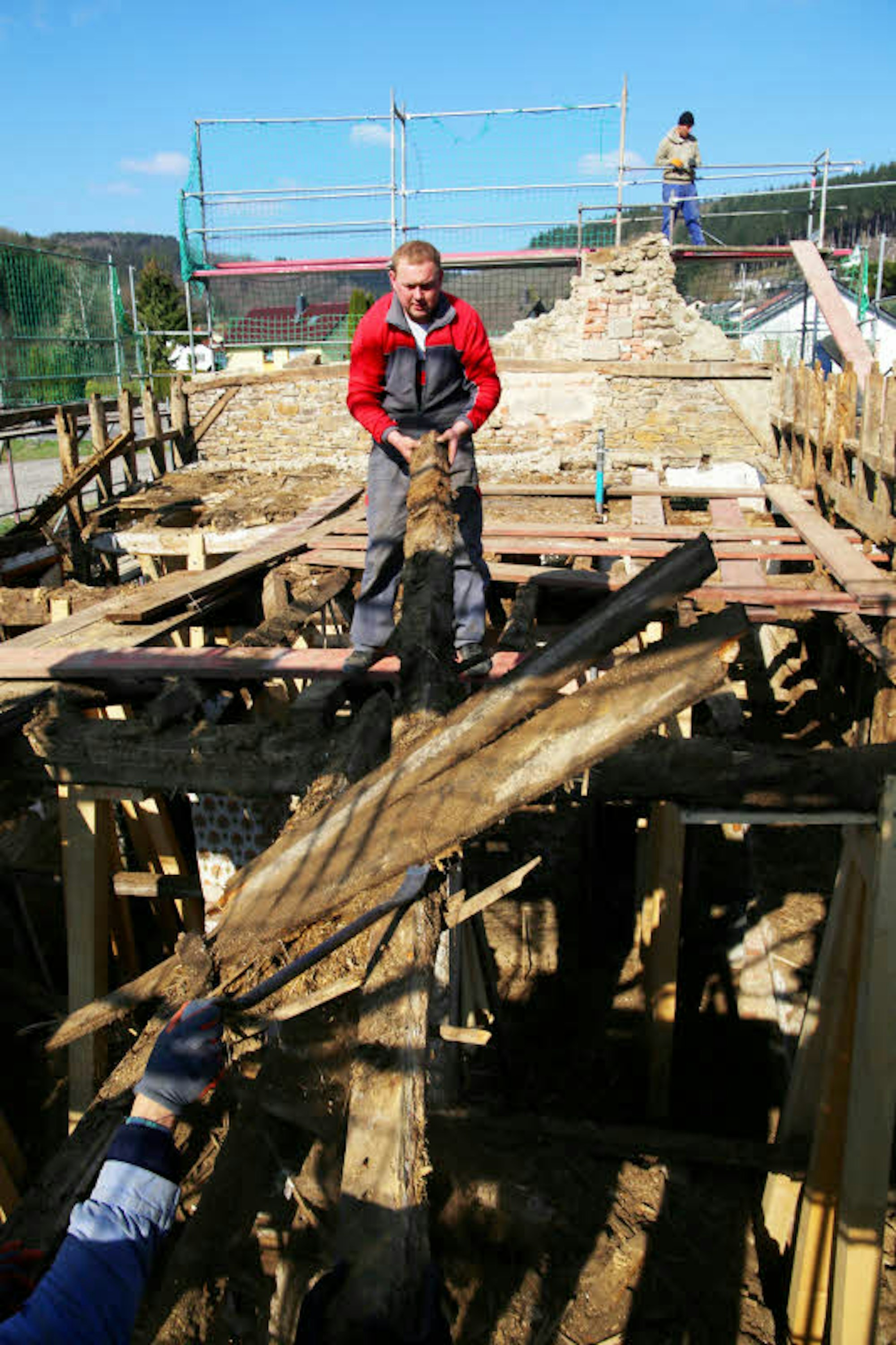 Über die Jahrhunderte hat sich jede Menge Staub auf den Balken angesammelt, die die ehrenamtlichen Helfer der IG Bauernhaus einen nach dem anderen abnehmen. Was nicht gebraucht wird, wird mit Nageleisen abgehebelt und segelt in die Tiefe des Kellers. „Das gute Brett“, scherzt einer und sieht dem verrotteten Stück Holz hinterher, das von einem Eichenbalken abgetrennt wurde.