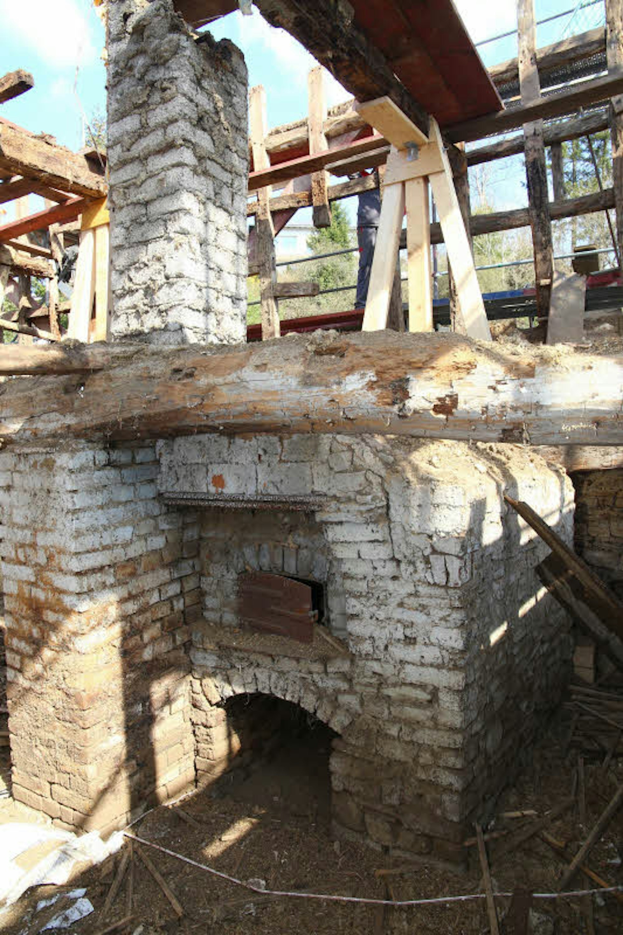 Rund um das Gebäude sei der Boden aufgeschüttet worden, weswegen das Erdgeschoss zum Keller geworden sei. „Auf der Rückseite fehlt uns eine ganze Reihe Fachwerk“, erzählt er. Aber die Bruchsteinwand mit dem großen Kamin sei grandios.