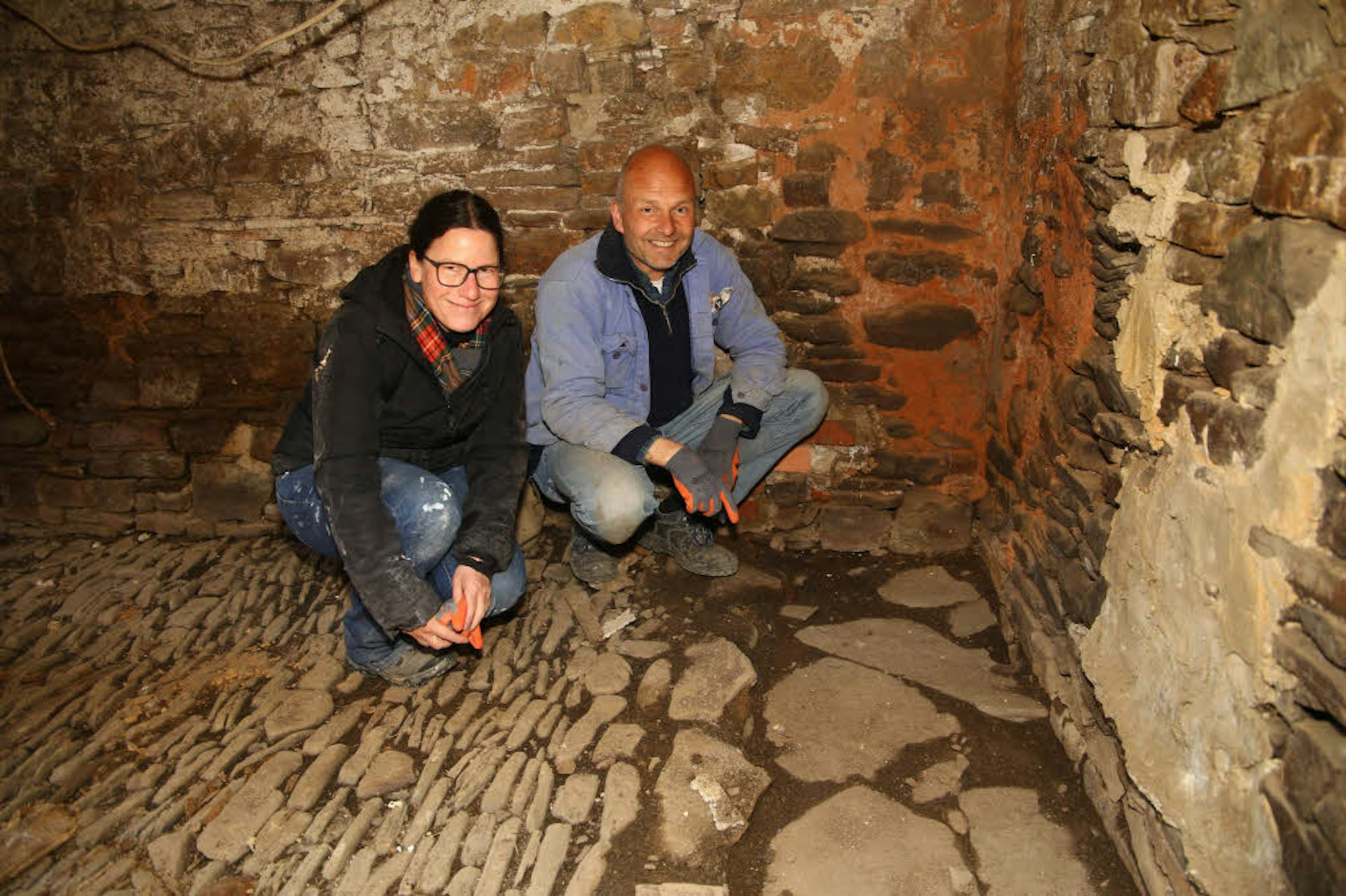 Den Kellerboden begutachten Dr. Julia Ricker und Hajo Meiborg.