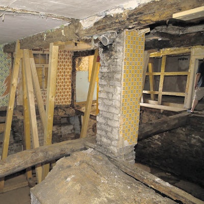 Probleme bereiten massive Kriegsschäden. So ist am Kamin eine Ziegelplombe wie am Kölner Dom zu sehen, wo das Haus im Zweiten Weltkrieg einen Treffer kassiert hat. Dadurch drohte der Kamin beim Abbau abzukippen.