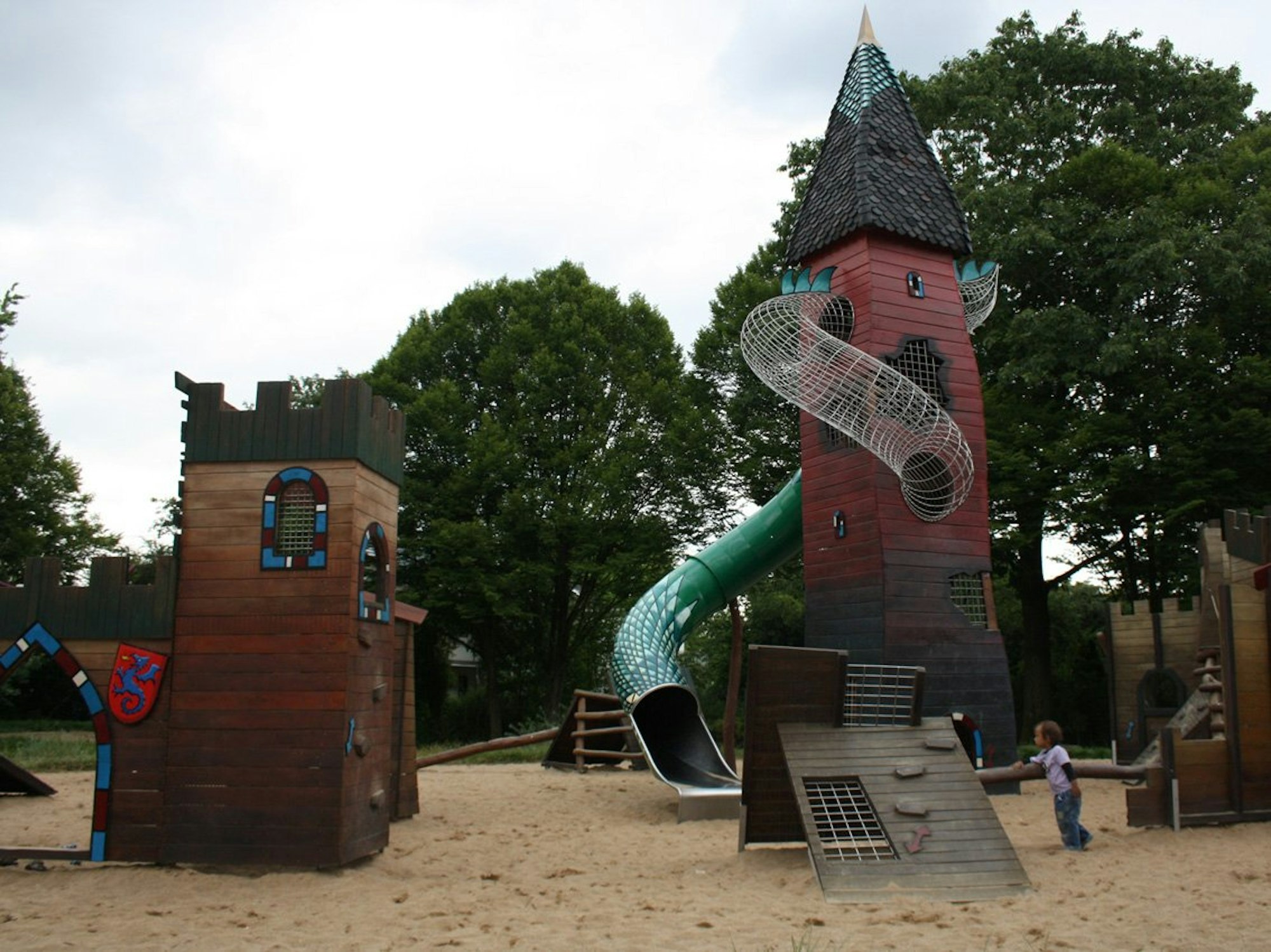 Spiel und Spaß: Schaukeln, Karussell und Rutsche; außerdem: Spielbereiche mit Bäckerei, Gasthof oder Rapunzel-Turm; kleine Holzbauten; direkt nebenan gibt es zwei Bolzplätze.