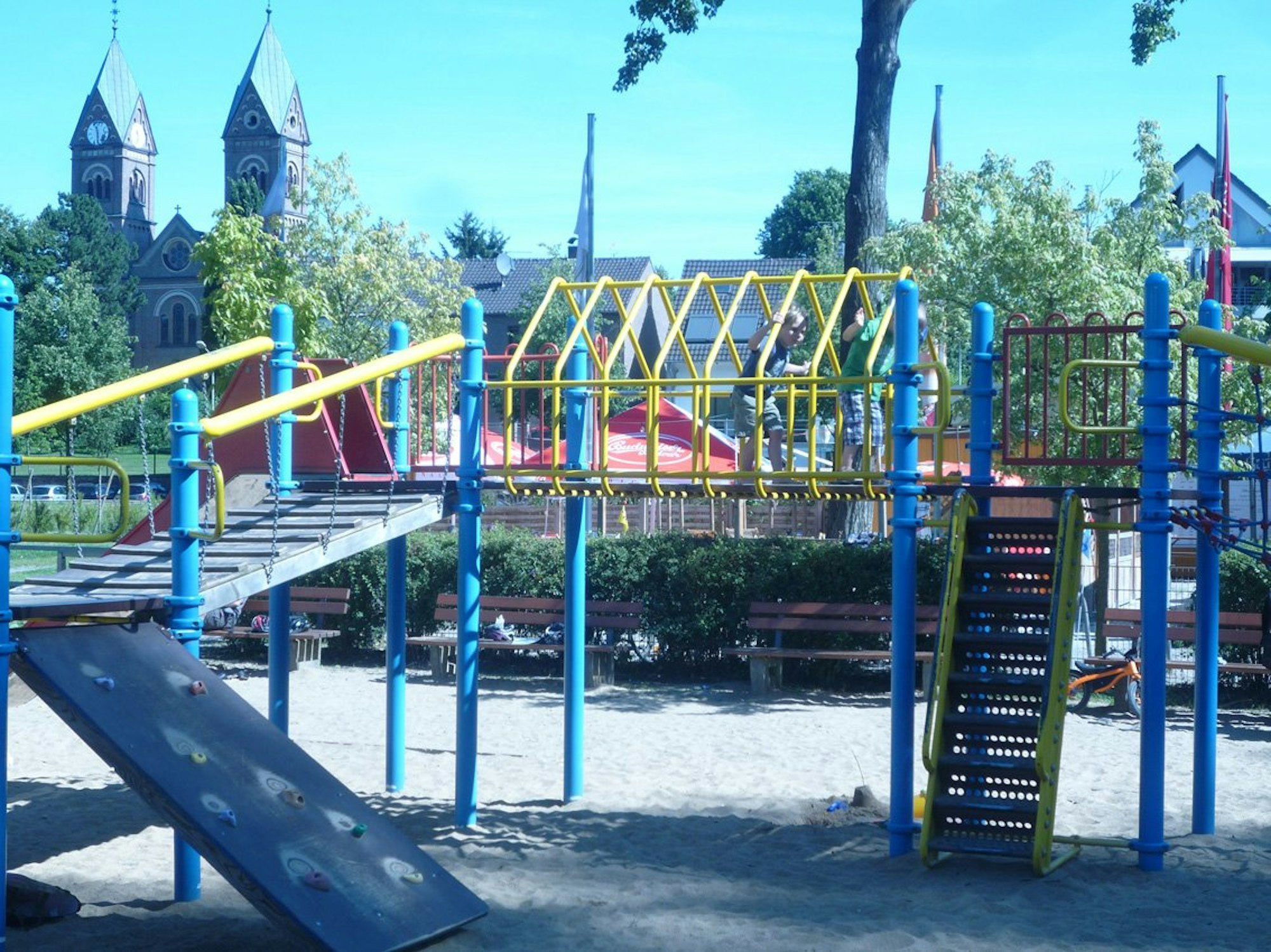 Spiel und Spaß: Kleiner Spielplatz direkt am Rhein. Kletterspielplatz mit Hängebrücken, Rutschbahn, Balancier-Element, Karussell, ausreichend Sand.