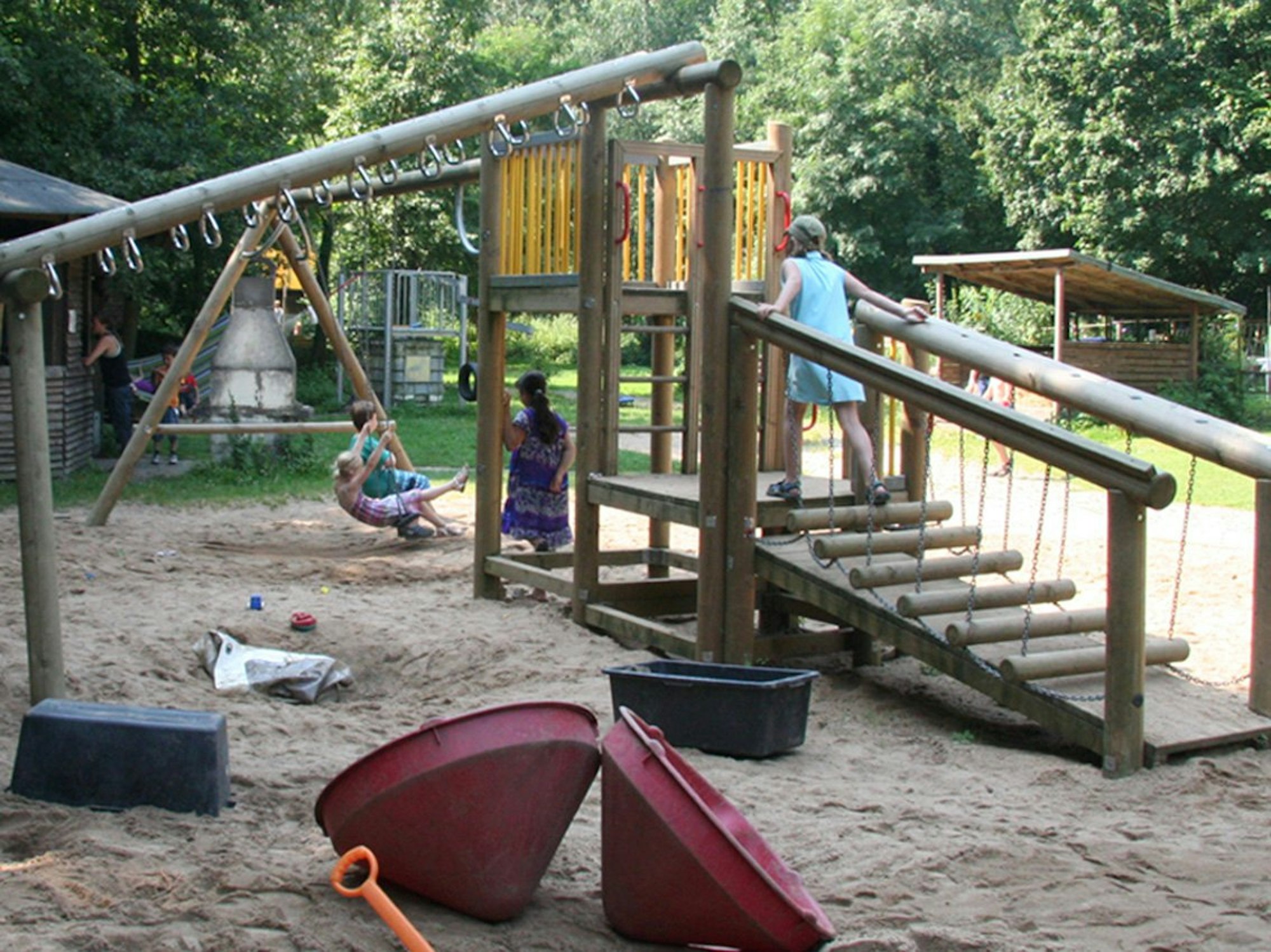 Spiel und Spaß: Auf dem 10 000 Quadratmeter großen, hügeligen und baumbestandenen Naturgelände gibt es für kleine und große Entdecker allerlei abenteuerliche Aktivitäten in unkommerziellen Ambiente: Tarzanschaukel, mit der man sich über eine Mini-Schlucht schwingen kann, Baubereich (Material bekommt man bei einem der drei Mitarbeiter, die die Kinder beim Hämmern und Sägen anleiten), Kettcars, mit denen man eine Runde über das Gelände fahren kann, ein altes Auto und ein Traktor, kleiner Teich mit Piratenschiff, Schaukeln, Rutschen und Sandkästen.