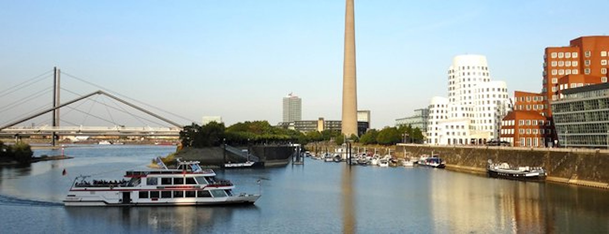 Die Panoramafahrt durch Düsseldorfs Medienhafen bis zur Theodor-Heuss-Brücke und zur Rheinuferpromenade zurück, dauert etwa 45 Minuten. Start ist die Anlegestelle Rheinuferpromenade/Pegeluhr.