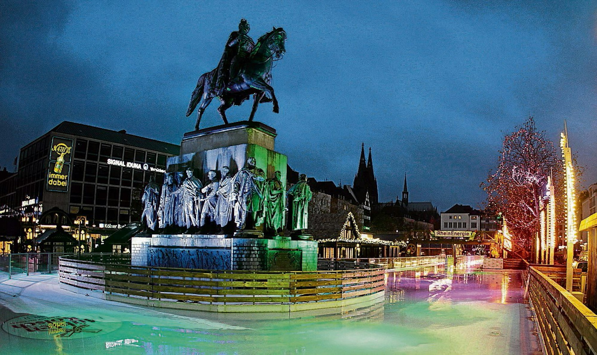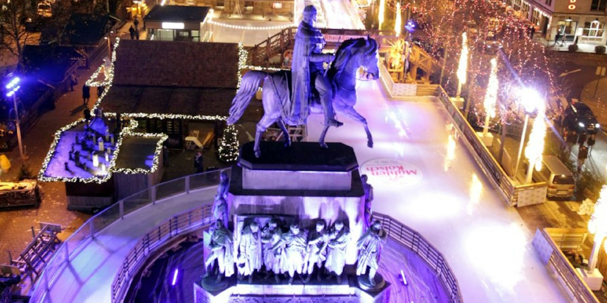 Eislaufen in stimmungsvoller Weihnachtsatmosphäre kann man bis zum 8. Januar auf der 400-Meter-Eis-Bahn am Kölner Heumarkt. Die Bahn schlängelt sich um das Reiterdenkmal des Preußenkönigs Friedrich Wilhelm III. herum. Die Bahn ist fast 110 Meter lang und bietet 1600 m² Eislauf-Fläche. Zusätzlich zu der Eislauf-Fläche gibt es in diesem Jahr noch fünf Eisstockschießbahnen, die direkt an eines der großen Schankhäuser angrenzen.