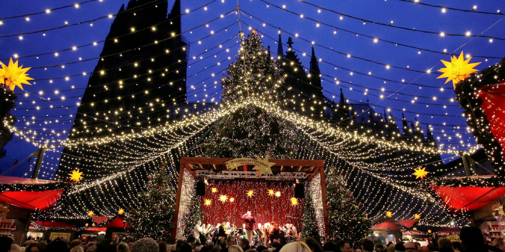 Der Klassiker unter den Weihnachtsmärkten in Köln: der Budenzauber auf dem Roncalliplatz im Schatten des Doms.