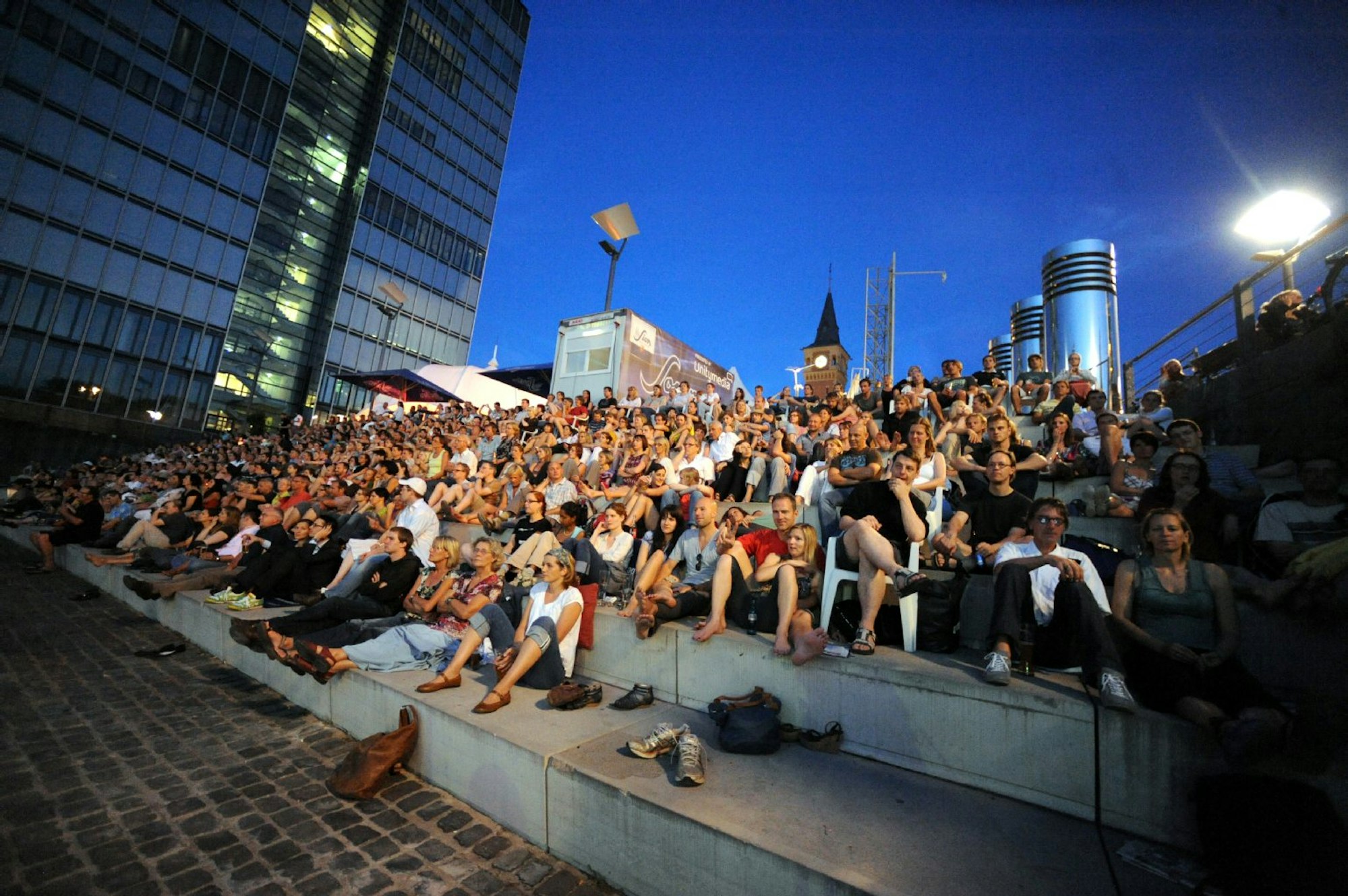 Stadionatmosphäre gleich am Rhein unter freiem Himmel: Das bietet das Sion Sommerkino im Rheinauhafen. Wo sich normalerweise Film-Fans vor der schwimmenden Großleinwand tummeln, werden ab dem 17. Juni auch Deutschlandfarben zu sehen sein. Die Spiele der deutschen Nationalmannschaft werden allerdings auf mehreren Fernsehbildschirmen gezeigt, da die Sonne währen der Spielzeiten noch nicht untergegangen ist. Man würde auf der Leinwand nichts erkennen.