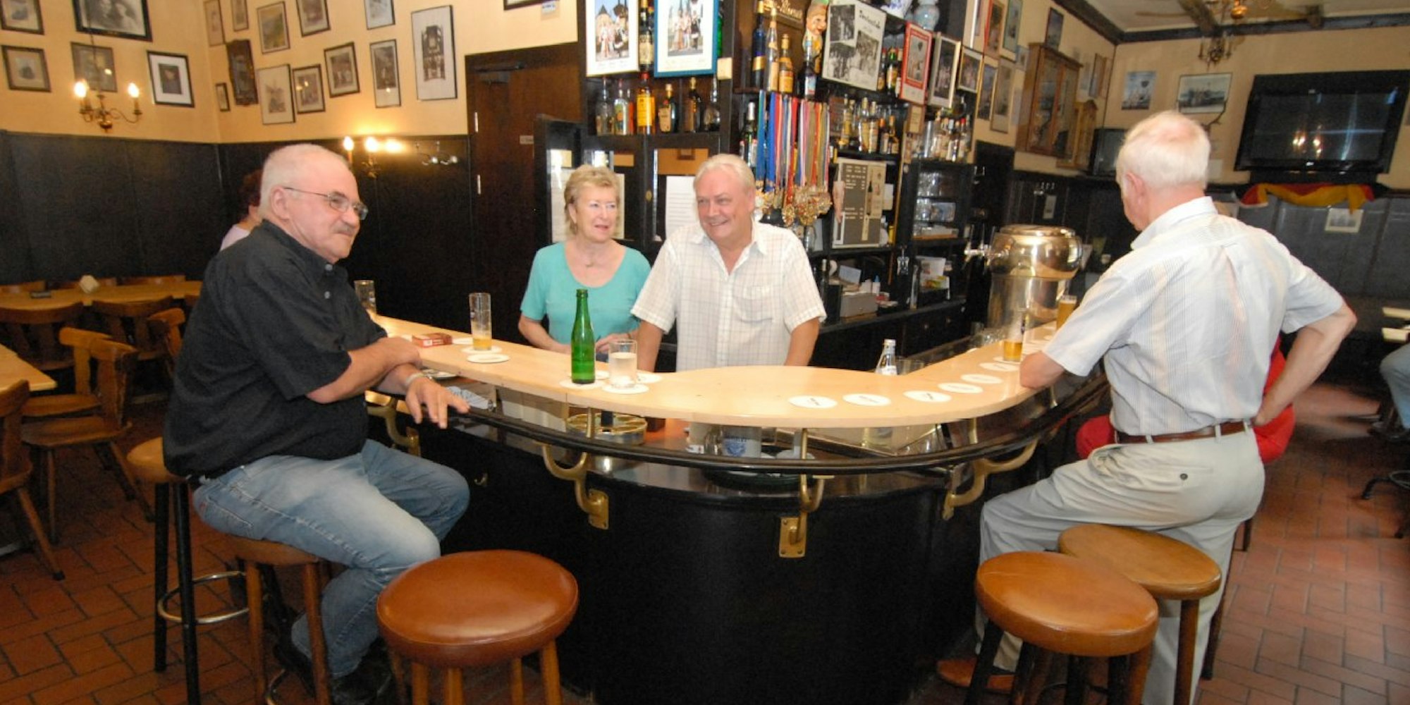 Karnevalsorden und Bilder von Kölner Dreigestirnen lassen erahnen, dass es an den "tollen Tagen" hier hoch her geht. "Das ist richtig schön und nie krawallig. Manchmal singen und schunkeln alle Gäste", schwärmt Elke Huth. Ein weiterer wichtiger Anlass zum Feiern ist der gemeinsame Geburtstag der Huths, der mit Stammgästen begangen wird. In diesem Jahr wird der Termin ausnahmsweise auf den September verschoben, denn es wird ja auch das "100-Jährige" standesgemäß gefeiert.