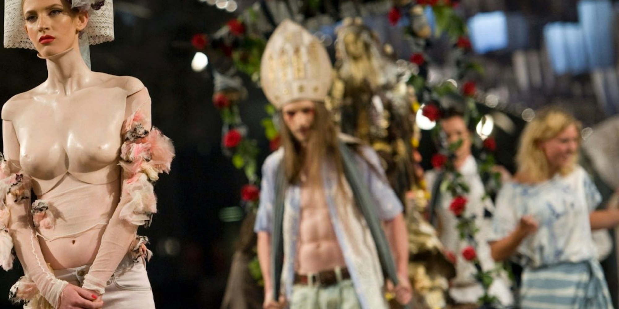Models präsentieren bei der Show "Denim Religion" im Rahmen der Berlin Fashion Week Jeansmode.