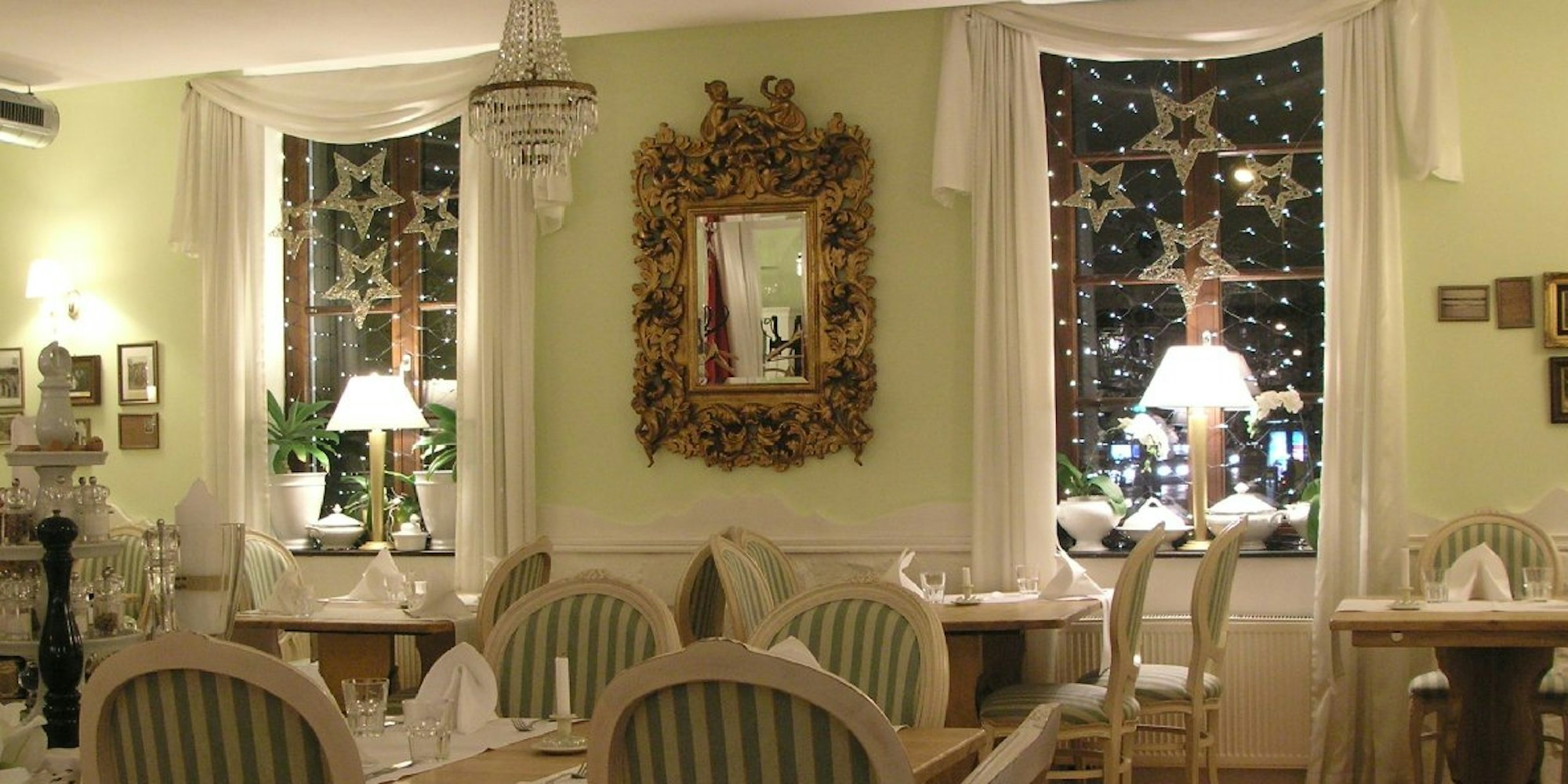 „Ich liebe es, den Raum stets zu verwandeln. Im Frühling schmücke ich alles mit frischen grünen Zweigen, Ostern stehen hier bis zu 20 echte Straußeneier, im Sommer greife ich in meine Muschelsammlung und im Herbst hängt hier alles voller Vogelkäfige.“ Jetzt ist das „Wohnzimmer“ weihnachtlich dekoriert, Lichtergirlanden und unzählige weiße Glitzersterne sorgen für ein besonderes Ambiente. „Wir rüsten noch auf“, sagt der Architekt und Restaurantinhaber Bialy. „Es kommen mindestens 20 kleine Weihnachtsbäume und Miniaturhirsche mit echten Fell dazu.“ Auch die Hintergrundmusik ist bewusst ausgewählt.