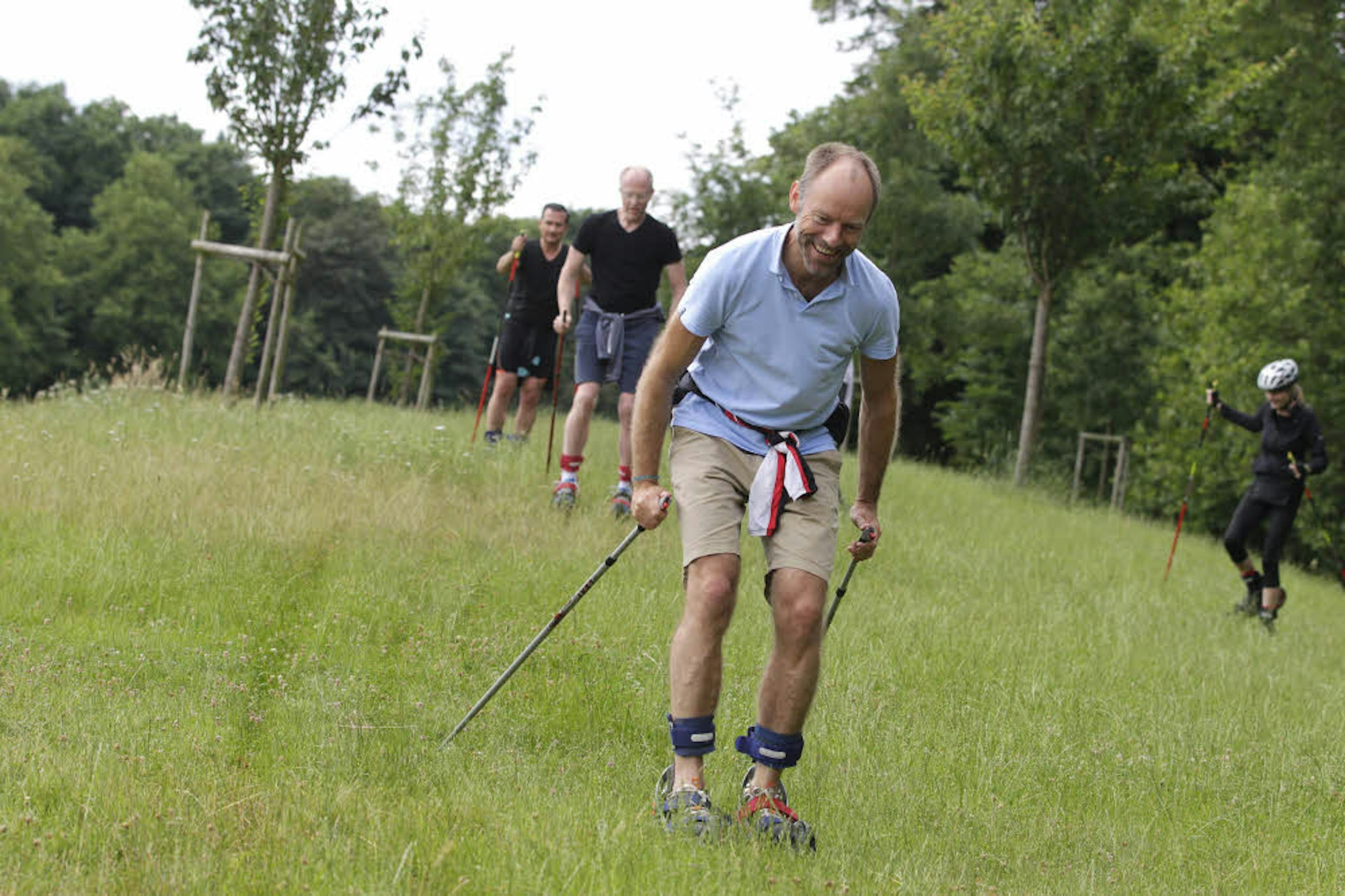 Inzwischen haben auch Ingo und Ulrike ihre Skikes angeschnallt, stellen sich auf Meurers Kommando im Kreis auf und absolvieren ein paar Aufwärmübungen, indem sie abwechselnd die Beine heben. Danach geht es auch schon auf die Strecke.