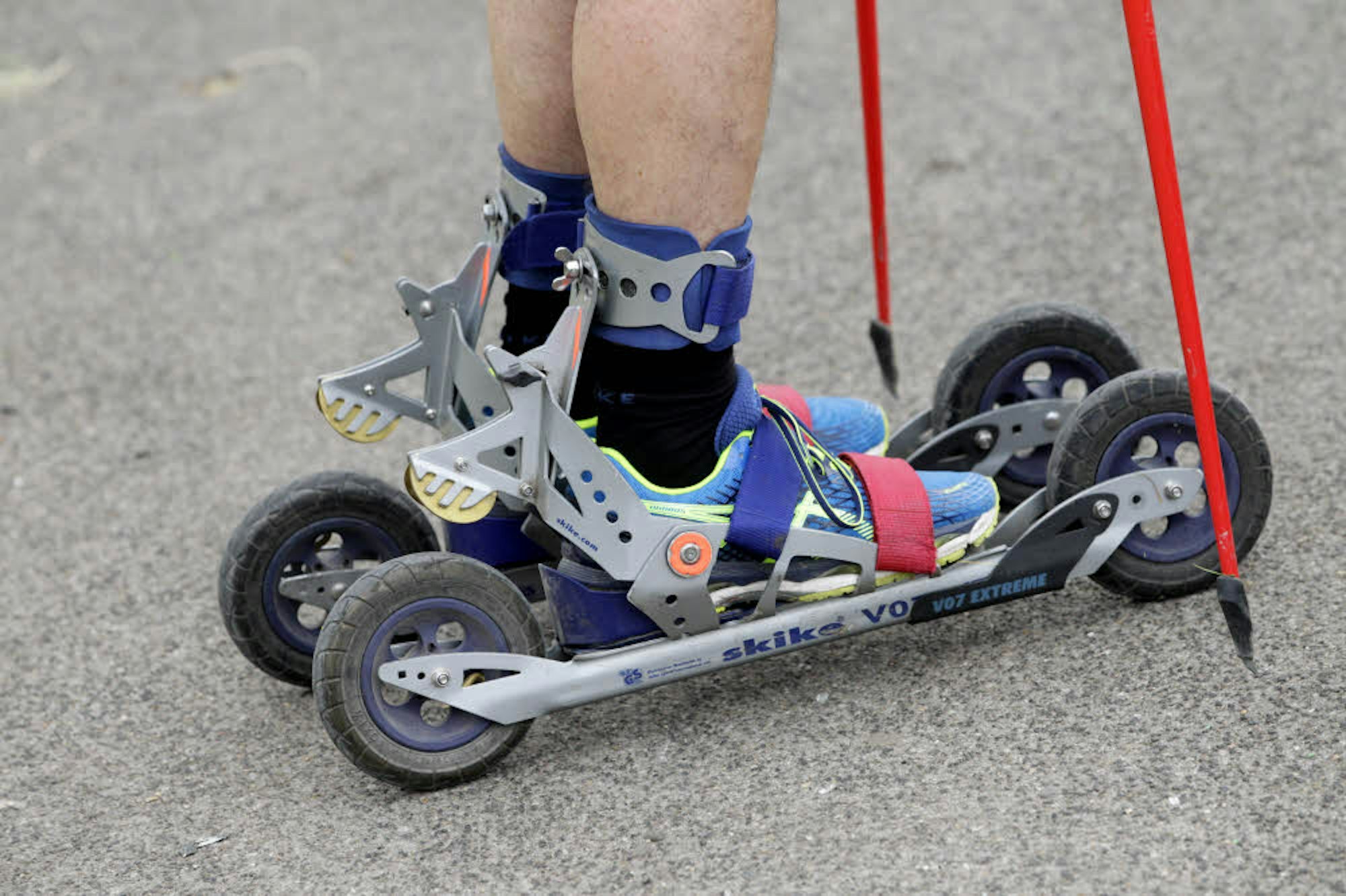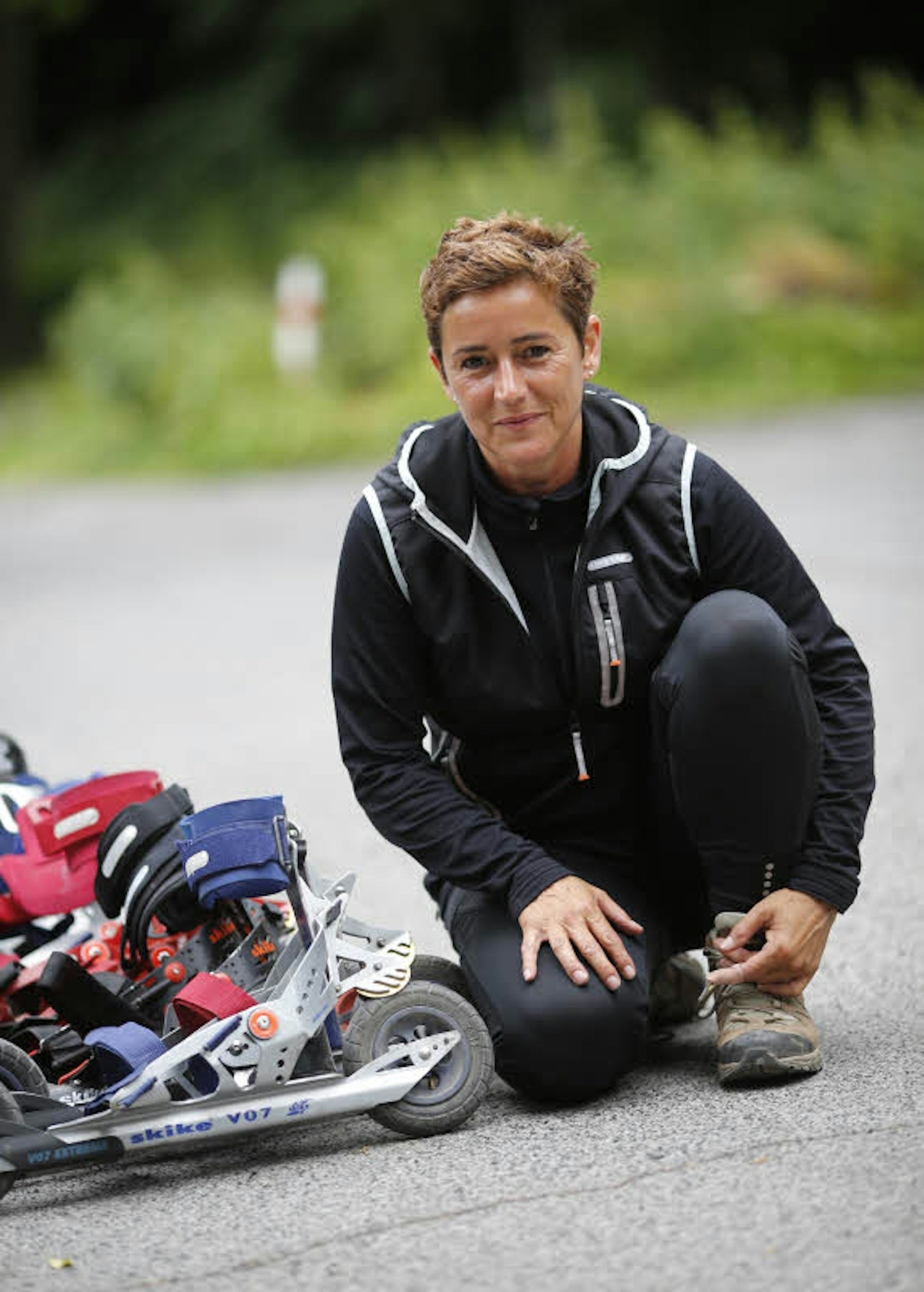 „Die Sportart kommt aus Österreich und sei ursprünglich von Biathleten erfunden worden, die nach einer Trainingsmöglichkeit im Sommer suchten“, erklärt die lizensierte Skike-Trainerin, während sie Klaus beim Einstieg in die je nach Schuhgröße verstellbaren Skikes hilft. Drei Bänder mit Klettverschlüssen fixieren den Fuß auf der Schiene. Dann macht sich Meurer an zwei wichtigen Flügelmuttern im Fersenbereich zu schaffen. Damit passt sie die Bremsen gewissermaßen dem Leistungsstand des Fahrers an.