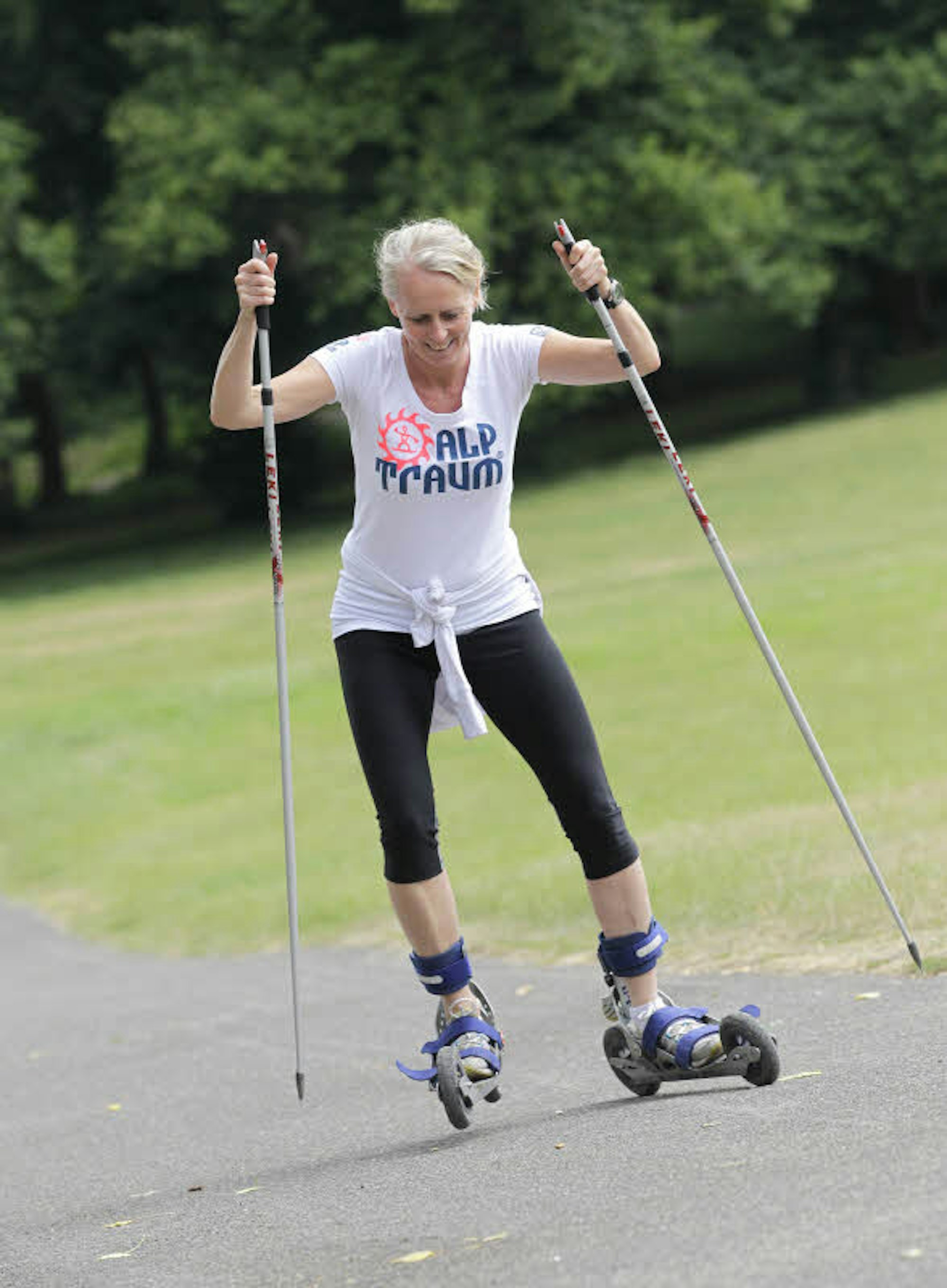 Es rumpelt unter den Füßen, und jeder Schotterstein erscheint im ersten Moment wie ein unüberwindbares Hindernis. Bei Bernd hingegen wirken schon die ersten Bewegungen so fließend, als habe sich der Mittvierziger schon oft auf diese Weise fortbewegt. „Ich fahre nächstes Jahr die Vierschanzen-Tournee mit“, witzelt er, derweil auch Ingo sich „wie auf dem Weg zur Piste“ fühlt. „Wir stehen tief, locker in den Knien, den Oberkörper leicht vorgebeugt, die Schulter gibt die Richtung vor“, instruiert Meurer und fährt im eleganten Schwung voraus. „Schöne lange Bewegungen wie beim Walzer“, ruft sie uns zu. Alles klar.