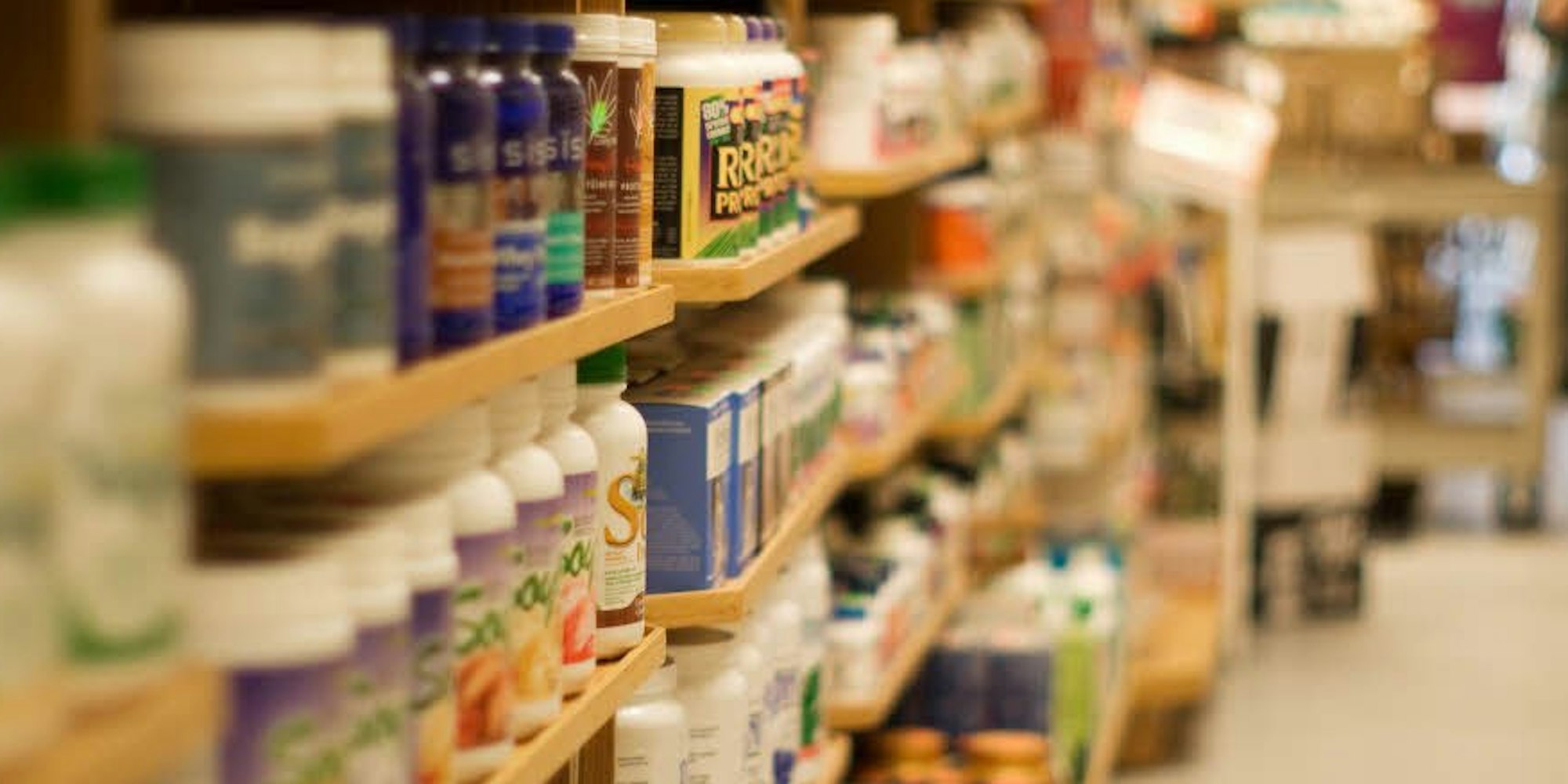 Farbeimergroße Dosen: Regal in einem „Supplement-Shop“