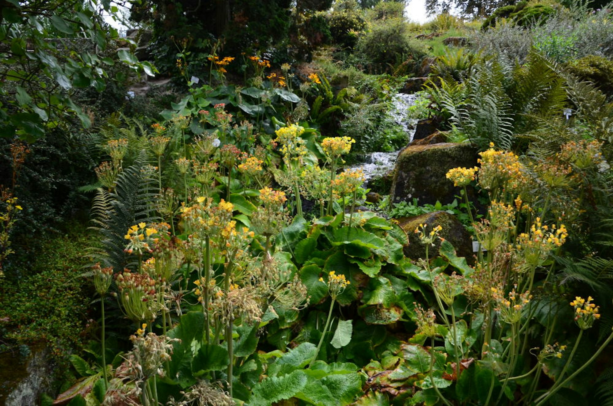Mit Primeln und Greiskraut wird der Saum eines Bachlaufs nachempfunden.