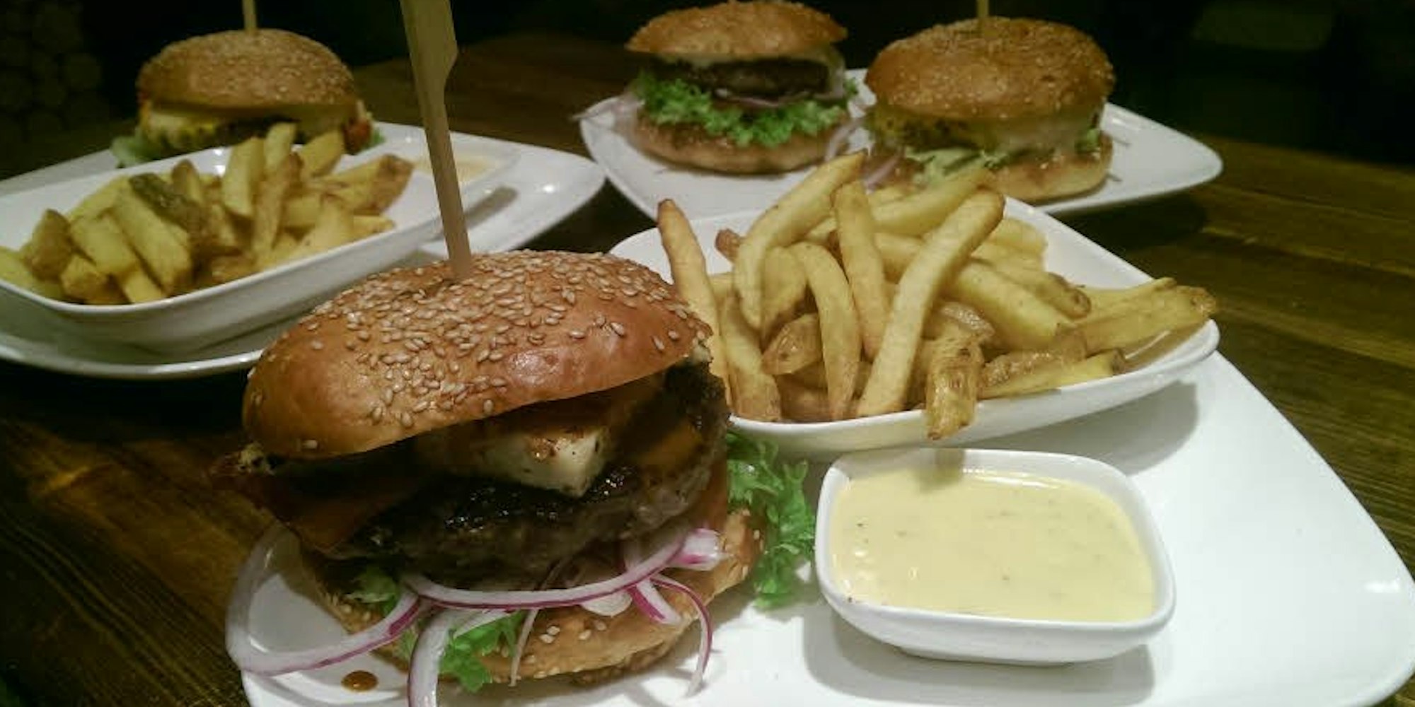 Theke mit Fritteuse und Burger-Grillplatte, Angebotstafel darüber, Kühlschrank zur Selbstbedienung, alles geht zügig, der Theken-Mann ist freundlich, aber nicht aufgesetzt kumpelhaft, die Bestellung bearbeitet er beflissen. Wenig später kommen zwei große Burger auf den Tisch, die gibt es zur Mittagszeit mit frischen Pommes, die Potenzial haben, aber sorgfältiger gegart sein müssten, dazu Mango-Minz- und Knoblauch-Aioli-Dip auf den Tisch. Alles nicht legendär, aber alles okay.