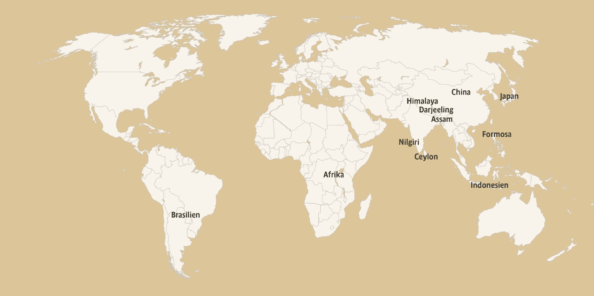 Darjeeling: Der Tee wächst hier sehr hoch an den Südhängen des Himalaya in Nordostindien. Tee aus dieser Gegend gilt als Champagner unter den Tees: Viele der rund 100 Teegärten sind so berühmt wie die guten Weinlagen Frankreichs. Der Tee wird in Höhenlagen von 800 bis 2000 Metern angebaut, Topqualität stammt aus den ganz hohen Gärten. Nach einer Erntepause beginnt hier die erste Pflückperiode im März. Diese ganz frühen Pflückungen sind besonders begehrt.
