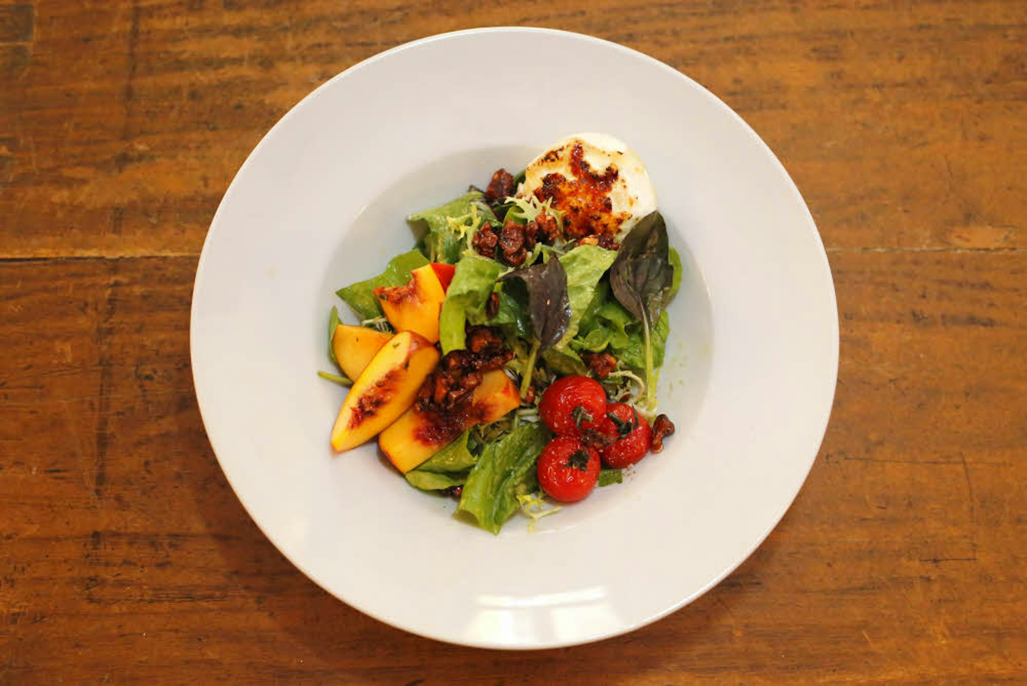 Blattsalat mit karamellisiertem Ziegenkäse, Thymianpfirsich und Walnuss-Crunch // 6,50 Euro