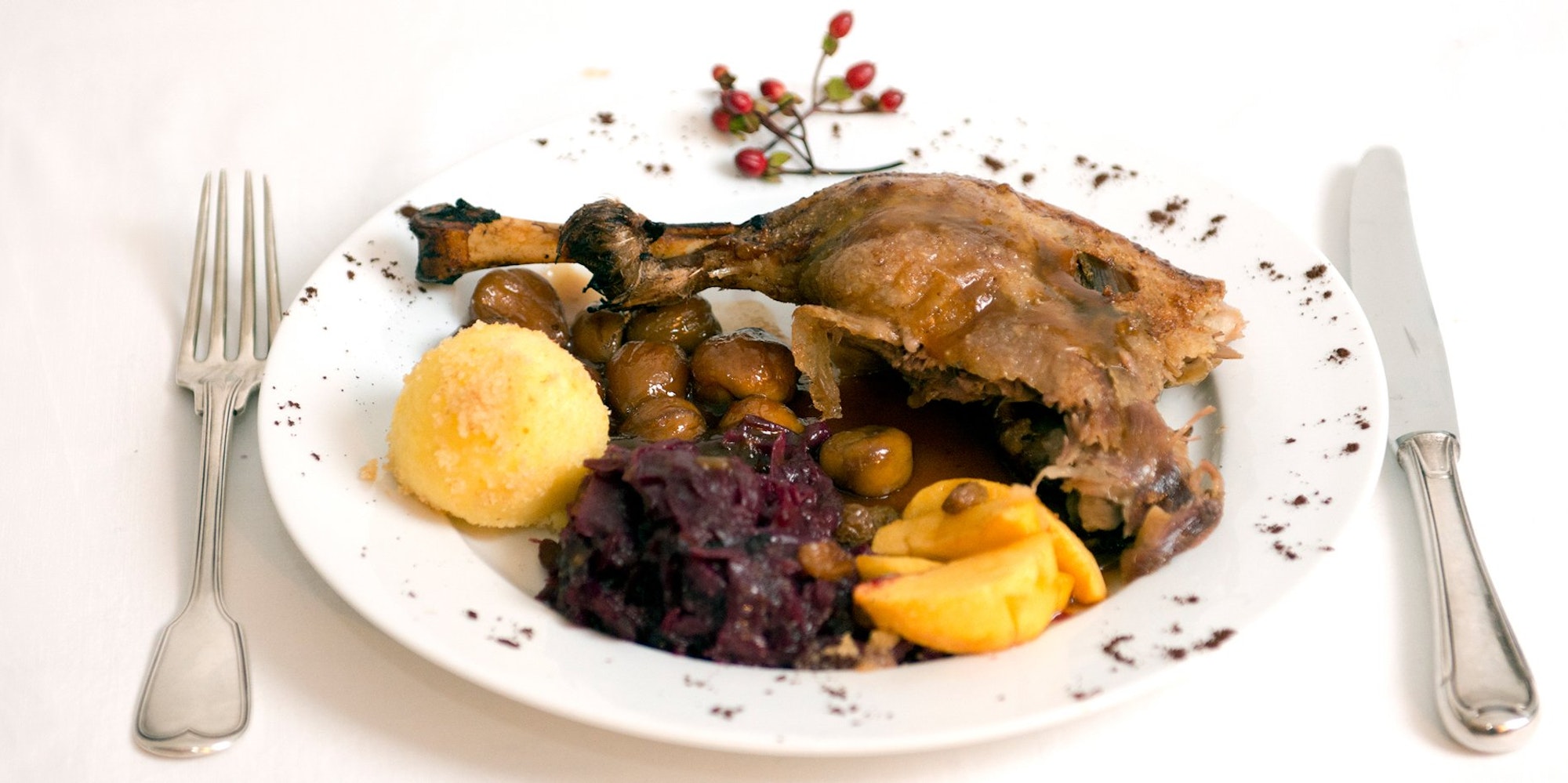Der gesamte Teller war eine Wucht, denn die Kartoffelklöße waren samt Brösel ideale Partner zum samtig-sämigen Jus. Der Rotkohl mit angenehmer Säure, passte super zu den kandierten Maronen. Die waren nämlich nicht nur süß, sondern – mit Sternanis und Nelken gewürzt – geradezu weihnachtlich. Nur die Äpfel ließen uns stutzig machen: Versprochen waren Marzipanäpfel, stattdessen kam Apfelkompott mit Rumrosinen. Aber auch diese Süße fügte sich erstaunlich gut ins Ganze. (eva)