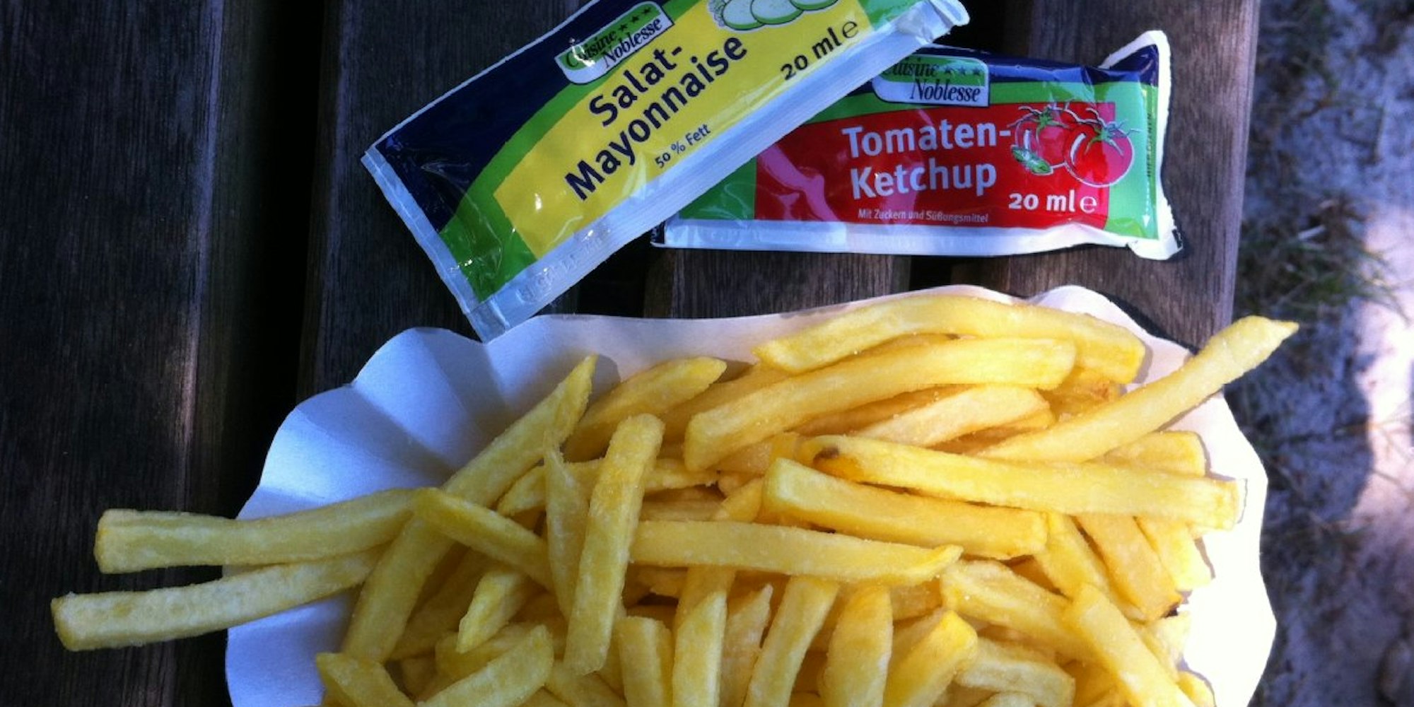 Stehen die Tage im Zeichen der Wüstenhitze, läuft im schönen Freibad die Imbiss-Versorgung an einem Pavillon, neben dem drei Biertische mit Bänken unter großen Sonnenschirmen stehen. Einladend – also Pommes her. Die kleine Portion ist für 2 Euro (groß 4 Euro) im Umfang in Ordnung. Convenience-Produkte werden generell immer besser, so ließe sich auch an diesen Fritten nichts weiter aussetzen – niemand tut schließlich so, als würden irgendwo hinterm Häuschen frische Kartoffeln geschält – hätte der Fritteur die Technik im Griff. Da aber diese Pommes der Art lange dünne Stäbchen viel zu kurz in sauberem aber wohl nicht entsprechend heißem Fett gegart wurden, das: blassgelb, kein kross, lasch, gut die moderate Salzwürze. Rot-weiß aus Tütchen zu 30 Cent konnte auch kein echtes Pommes-Vergnügen mehr anwürzen. Das läuft unter vergebener Chance, könnte aber ganz einfach gelingen. (don)